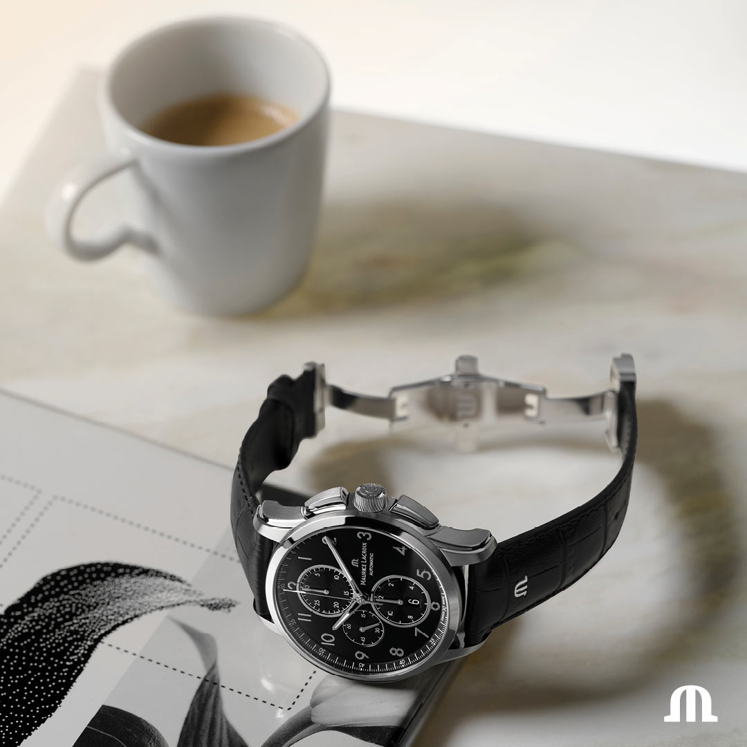 Dekiel ekspozycyjny umożliwia podziwianie automatycznego kalibru ML 112. Ten szwajcarski mechanizm został ozdobiony wykończeniem poziomym Côtes de Genève i okrągłym usłojeniem, podczas gdy wahnik udekorowano pionowym Côtes de Genève oraz szczotkowaniem słonecznym. Automatyczny zegarek męski z chronografem Maurice Lacroix został zaoferowany na czarny pasek ze skóry aligatora. Na pasku tym widnieje legendarne już logo M, detal, który wzmacnia ogólne poczucie wartości. Zgodnie z charakterystyką tej popularnej kolekcji, nowy PONTOS Chronograph 43 mm został wyposażony w system łatwej wymiany paska. Gwarantuje on prosty, łatwy w użytku sposób wymiany paska na inny bez konieczności używania narzędzi.