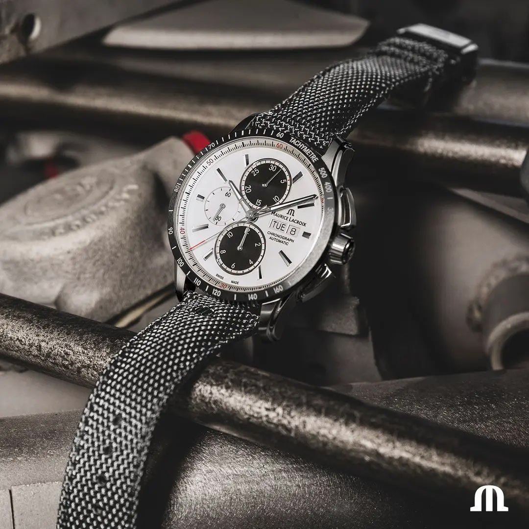 Na pierwszy rzut oka może wydawać się, że tarcza tego sportowego zegarka męskiego na szarym pasku z nylonu Maurice Lacroix posiada tylko dwa liczniki ułożone wzdłuż osi północ-południe. Jednak przy bardziej uważnym przyjrzeniu się staje się jasne, że na godzinie 9 znajduje się mała subtarcza sekundowa oraz umieszczony naprzeciwko wyświetlacz dnia miesiąca i tygodnia, z których wszystkie są łatwe do odczytania. Dominujące liczniki składają się z 30-minutowego rejestru o godzinie 12 i 12-godzinnego rejestru poniżej. Każdy z nich składa się z piaskowanego środka i okrągłej ramki ze ślimaczym detalem. Zespół projektowy Maurice Lacroix wzbogacił kompozycję o liczne elementy, oddając użytkownikowi tarczę o różnych poziomach wysokości i z rozsądnie dobranymi kolorami, która wzbogaca wrażenia z posiadania.