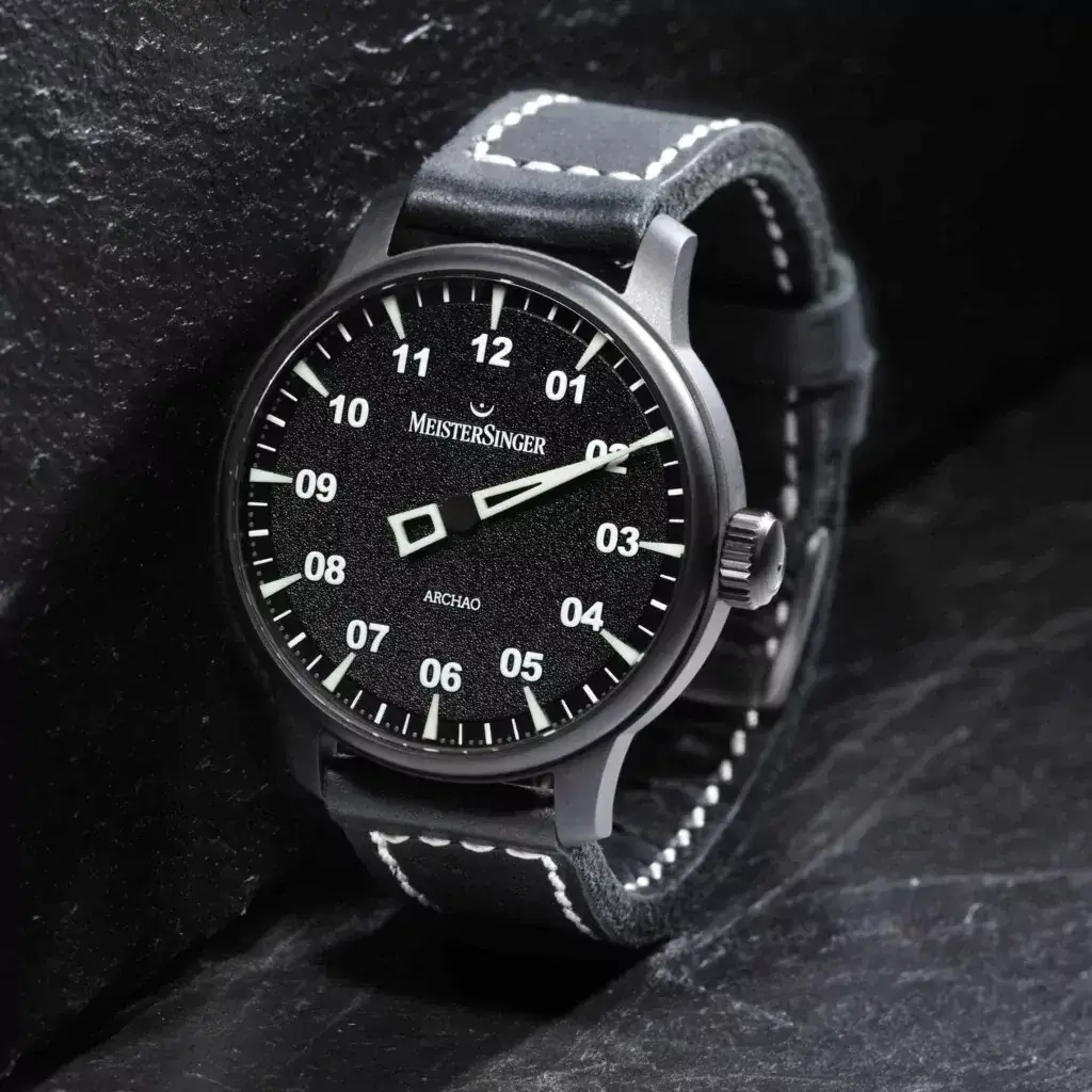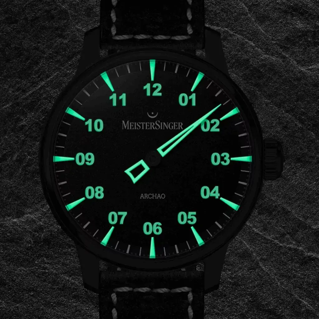Automatyczny zegarek męski MeisterSinger Archao DLC Black z czarną kopertą przyciąga uwagę także po zmroku, gdy tarcza z luminescencyjnymi detalami odsłania pełnię swojego wyrazistego charakteru. Wyraziste dwucyfrowe cyfry arabskie, aplikowane indeksy godzinowe i charakterystyczna igłowata wskazówka zostały wykonane w formie białych LumiBlocks, które magazynują światło niczym bateria, a następnie oddają je trwałą, intensywną poświatą. Dzięki temu MeisterSinger AR902BL jest nie tylko zegarkiem automatycznym o mocnej tożsamości wizualnej, ale również modelem doskonale czytelnym w nocy. Imponująca koperta o średnicy 43 mm została wykonana ze stali szlachetnej i pokryta matowoczarną powłoką DLC o strukturze diamentu, co podnosi odporność powierzchni i podkreśla nowoczesny, techniczny charakter zegarka. Całość dopełnia wypukłe szkło szafirowe, przeszklony dekiel z nadrukiem, na którym nazwa modelu „Archao” pojawia się jako transparentny napis na tle inspirowanym wulkanem, oraz pasek z dekoracyjnymi przeszyciami, który harmonijnie podkreśla vintage’owy charakter modelu.