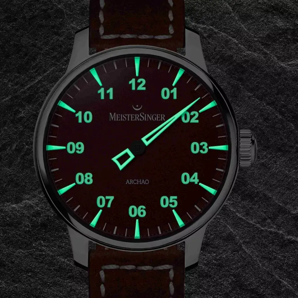 Automatyczny zegarek męski MeisterSinger Archao Red przyciąga uwagę także po zmroku, gdy bordowa tarcza z luminescencyjnymi detalami odsłania pełnię swojego wyrazistego charakteru. Wyraziste dwucyfrowe cyfry arabskie, aplikowane indeksy godzinowe i charakterystyczna igłowata wskazówka zostały wykonane w formie białych LumiBlocks, które magazynują światło niczym bateria, a następnie oddają je trwałą, intensywną poświatą. Dzięki temu MeisterSinger AR911BL jest nie tylko zegarkiem automatycznym o mocnej tożsamości wizualnej, ale również modelem doskonale czytelnym w nocy. Imponująca koperta o średnicy 43 mm została wykonana ze stali szlachetnej a całość dopełnia wypukłe szkło szafirowe, przeszklony dekiel z nadrukiem, na którym nazwa modelu „Archao” pojawia się jako transparentny napis na tle inspirowanym wulkanem, oraz bordowy pasek z dekoracyjnymi przeszyciami, który harmonijnie podkreśla vintage’owy charakter modelu.