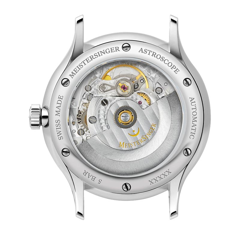 Jednak, mimo swej nieprzeciętności, ten charyzmatyczny Astroskop nadal pozostaje wierny nadrzędnym ideom marki. Meistersinger, kontynuując sympatie do tradycji wczesnego zegarmistrzostwa i tym razem oferuje nam rzadko spotykany, zegarek jednowskazówkowy. Dzięki temu, mamy możliwość dokładniejszego dostępu do zawartości tarczy chronionej przez najwyższej jakości szkło szafirowe o niezwykle wysokiej przejrzystości oraz bardzo dużej odporności na zarysowania. Koperta ze stali szlachetnej sprawi natomiast, że użytkownik Astroskopa będzie miał okazję długo cieszyć się nienaruszonym blaskiem oprawy swego kosmicznego sługi czasu.