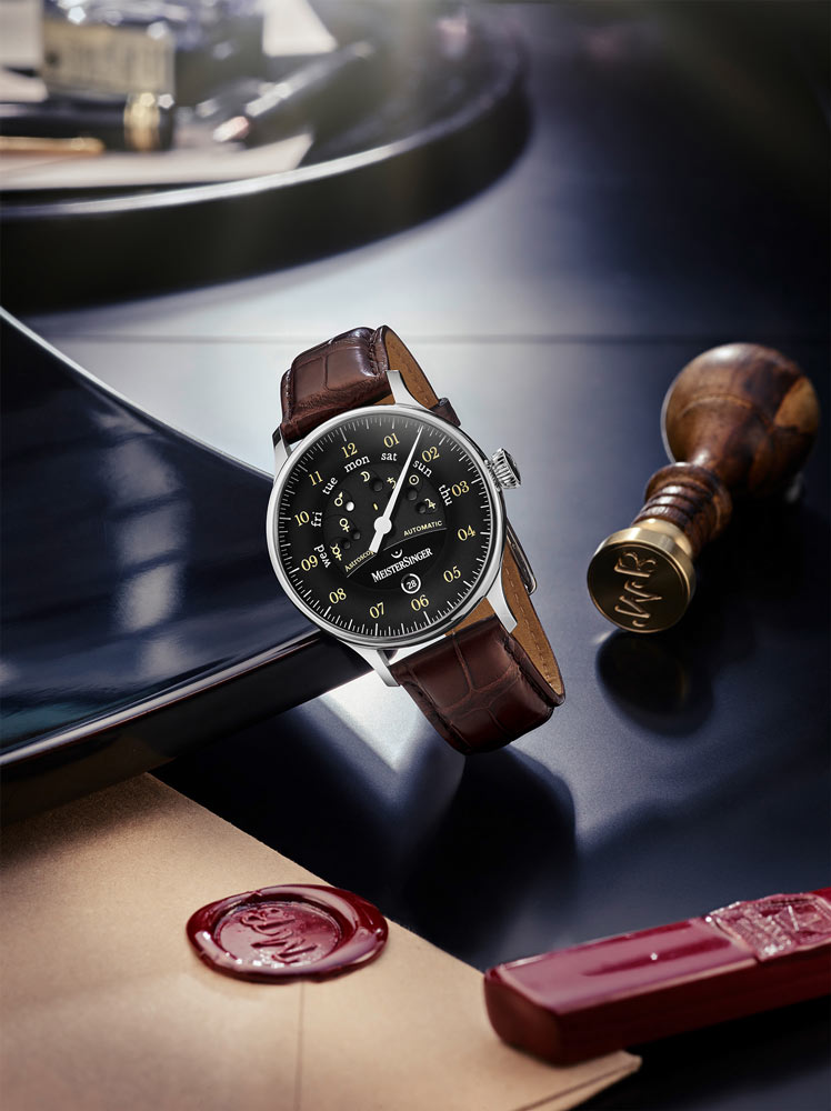 MEISTERSINGER ASTROSCOPE AS902OR, to unikalny zegarek niemieckiej kolekcji ASTROSCOPE, reprezentujący kolejną odsłonę astronomicznych czasomierzy Manfreda Brassler'a — założyciela i głównego projektanta MeisterSinger. Galaktyczna, czarna niczym ciemna materia tarcza zegarka, stanowi spójne tło dla jaśniejszych, arabskich oznaczeń godzinowych oraz nieregularnie rozmieszczonych dni tygodnia, pod którymi znajdują się symbole odpowiadających im ciał niebieskich. Podług wierzeń Babilończyków, liczba siedem, jest wartością świętą, a każdy dzień tygodnia związany jest z planetą, której nazwa pochodzi od bogów rzymskich.