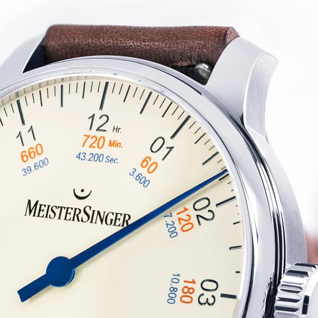Funkcjonalna typografia z ciągłymi cyframi godzinowymi od 01 do 12, pięciominutowe podziały obwodowe, pojedyncza wskazówka godzinowa w kształcie igły świadczą o tym, że ten zegarek męski retro jest prawdziwym klasykiem MeisterSinger. Ze średnicą 43 mm, najwyższej jakości wypukłym, szafirowym szkłem jego projekt wygląda jak z lat 60. Tarczę wyróżnia również precyzyjna skala czasu. Pod głównymi indeksami znajduje się skala minut oraz sekund, co pozwala dokładnie śledzić upływający czas. Zegarek MeisterSinger zestawiony został z paskiem skórzanym w kolorze brązowym. Jest on lekki, miękki i elastyczny, co zagwarantuje komfort w czasie noszenia.