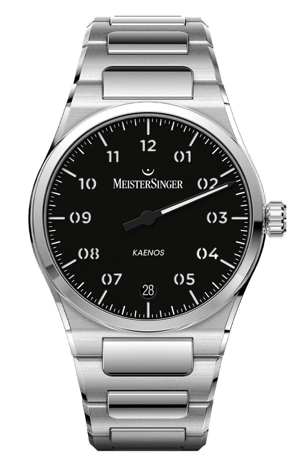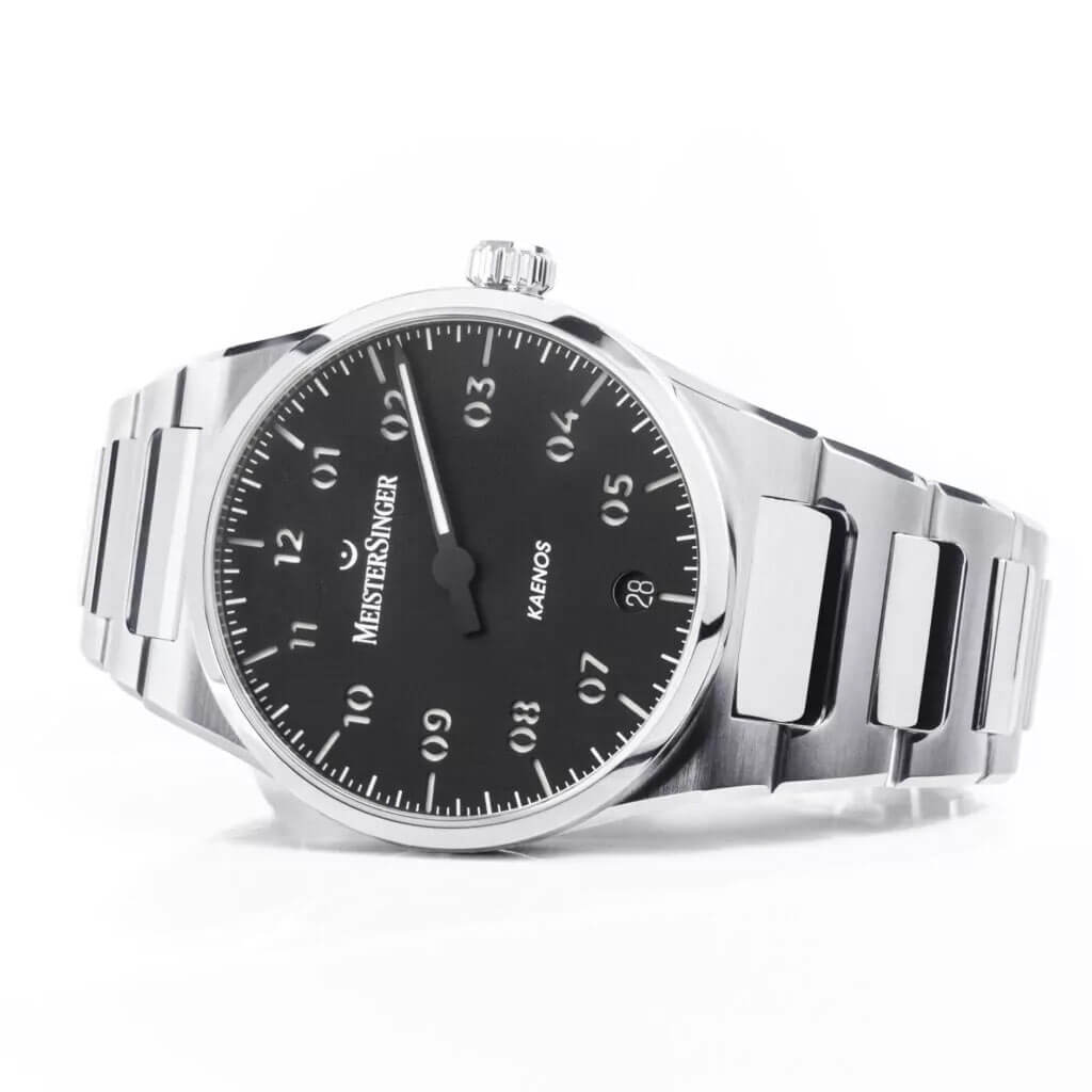 MeisterSinger Kaenos KS902 to model, który redefiniuje pojęcie klasycznego zegarka męskiego, wychodząc poza utarte rozwiązania stylistyczne. Projekt, oparty na idei jednowskazówkowego wskazania, pozwala spojrzeć na czas inaczej – nie jako sekwencję sekund, lecz jako przestrzeń do wykorzystania. Czarna tarcza z matowym wykończeniem i precyzyjnie nadrukowaną podziałką minutową zachowuje czytelność mimo niestandardowej formy, a charakterystyczna igłowa wskazówka porusza się płynnie, wprowadzając naturalny rytm w odczycie godziny.
