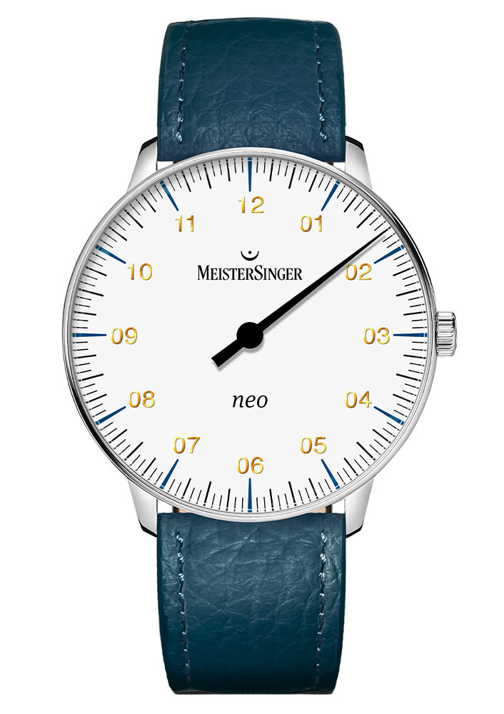 Funkcjonalna typografia z ciągłymi cyframi godzinowymi od 01 do 12, pięciominutowe podziały obwodowe, pojedyncza wskazówka godzinowa w kształcie igły świadczą o tym, że ten zegarek damski retro jest prawdziwym klasykiem MeisterSinger. Indeksy arabskie wyróżnia elegancki kolor złoty. Ze średnicą 36 mm, nieistniejącą ramką i najwyższej jakości wypukłym, szafirowym szkłem jego projekt naprawdę wygląda jak z lat 60. Przez aspekty konstrukcyjne Neo pełny profil wynosi jedynie 9.70 mm, co ułatwi noszenie czasomierza pod mankietem koszuli. Zegarek MeisterSinger zestawiony został z paskiem skórzanym w kolorze niebieskim. Jest on lekki, miękki i elastyczny, co zagwarantuje komfort w czasie noszenia.
