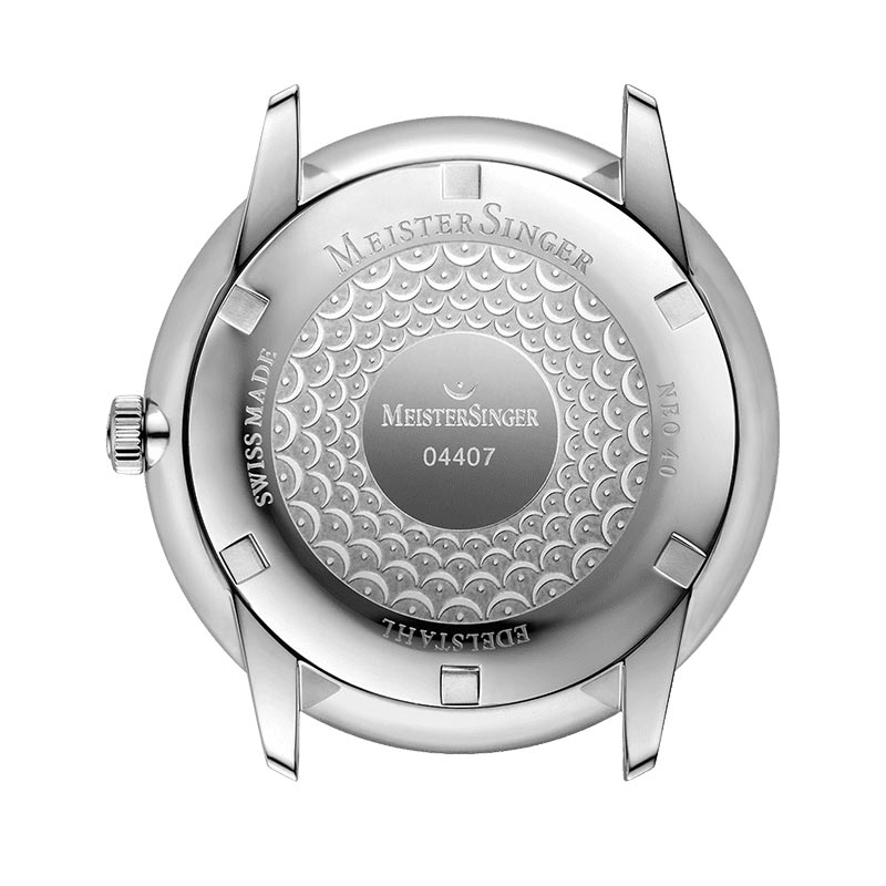 Prezentowany model to jeszcze lepiej wpisujący się w ideologię marki czasomierz, którego dodatkowa, centralnie umieszczona tarcza z funkcją datownika pozwala na ogólne rozeznanie się w etapie bieżącego miesiąca. W ten sposób zyskujemy poczucie miejsca, w jakim w danym dniu, na przestrzeni całego miesiąca się znajdujemy, co niewątpliwie stanowi cenny, pragmatyczny aspekt. O wierności do filozofii i praktykowanych norm firmy MeisterSinger świadczą również funkcjonalna typografia dwucyfrowych oznaczeń godzinowych oraz fazowana, kształtem przypominająca igłę — pojedyncza wskazówka w kolorze białym. Wszystkie wspomniane elementy tworzą obraz zegarka oszczędnego w formie, jednak wciąż o artystycznej finezji. Dokładnie z takich samych założeń wywodził się zrodzony w połowie XX wieku styl Bauhaus, do którego też zaliczany jest czasomierz. Tło, natomiast, stanowi - także prosta w formie - niebieska tarcza oprawiona w prawie niewidoczną, stalową, kopertę o grubości zaledwie 9 milimetrów. Koperta ta cechuje się wysokim połyskiem i odpornością na matowienie, nie wywołuje też alergii. Kopułowe szkło zakrywające cyferblat, to z kolei hesalit o nadających mu elastyczności właściwościach, a jego dodatkową zaletą jest możliwość łatwego wypolerowania.