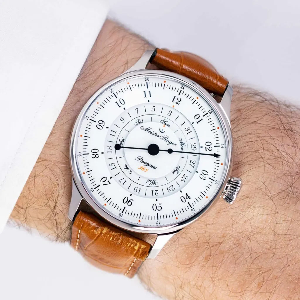 Interesującym rozwiązaniem jest koncepcja otwartego, wewnętrznego pierścienia. Jest to detal, który najlepiej odzwierciedla dewizę designu zegarka MaisterSinger. Aktualną datę można w bardzo łatwy sposób odczytać na godzinie dwunastej, nie spuszczając ze wzroku z pomiaru ubiegającego czasu, jak również innych dni tygodnia. Ponadczasowa klasyczna okrągła koperta urzeka swoją łagodną linią. Czytelny kontrastowy cyferblat współgra z przejrzystym delikatnie sferycznym szkłem szafirowym. Męski zegarek MeisterSinger Pangaea Day Date 365 wyposażono w dokładny szwajcarski mechanizm ETA 2836-2 / Sellita SW 220-1 nakręcany automatycznie. Kompozycja stylowego czasomierza oferowana jest na skórzanym pasku koloru jasnobrązowego z delikatnymi przeszyciami białą nitką. Czasomierz jest z pewnością doskonałym dodatkiem do sportowo-eleganckiego ubioru.
