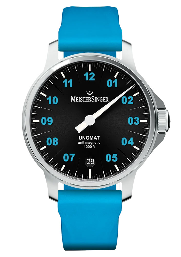 MeisterSinger Unomat UN902BLU, to wyjątkowy czasomierz, w którego zaszczepiono techniczną i kulturową tradycję wczesnego zegarmistrzostwa, a zarazem nowoczesne rozwiązania, dostarczające satysfakcji na każdym polu. Jego wygląd ma się kojarzyć z naukowym i wodnym instrumentem, służącym do pomiaru czasu, co zresztą stanowi unikalną cechę wszystkich dzieł niemieckiego producenta MeisterSinger. Sposób, w jaki zegarek wskazuje czas, jest niezwykle efektywny. Unomat ma szeroką wskazówkę igłową, która jasno świeci dzięki powłoce luminescencyjnej, która znajduje się również na indeksach arabskich.