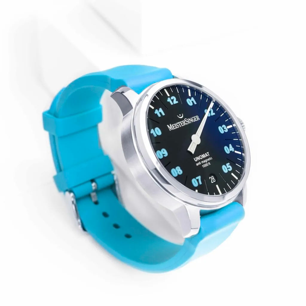 Model o numerze referencyjnym UN902BLU stworzono tak, aby mógł przetrwać surowe warunki i by nigdy się nie poddał. W tym celu powstała wytrzymała koperta ze stali nierdzewnej o średnicy 43 mm. Posiada ona solidne boki, ochraniające zakręcaną koronkę przed wstrząsami i uderzeniami. Jej uszy płynnie integrują się z paskiem gumowym z zapięciem na klamerkę. Pasek w pięknym kolorze Arctic Blue jest elastyczny i w przyjemny sposób ułoży się na nadgarstku. Zegarek męski MeisterSinger Unomat jest doskonałym kompanem w trakcie pływania, jak i nurkowania. Jego klasa szczelności oceniona została na 300 metrów.
