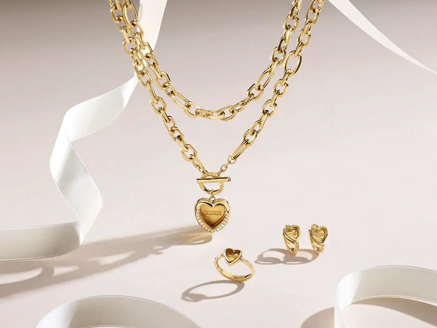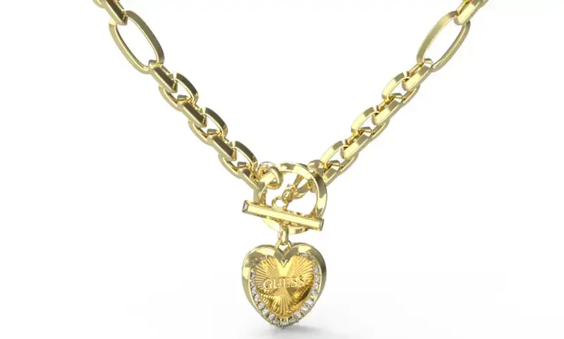 Naszyjnik gruby złoty łańcuch Guess Mon Amour JUBN04598JWYGT/U zachwyca podwójnym, masywnym łańcuchem kotwicznym wykonanym ze stali chirurgicznej i imponującą długością 92 cm. Zawieszka w kształcie serca dodaje mu elegancji – polerowana z zewnątrz, z wewnętrznym promienistym wzorem, zdobiona logo Guess i kryształkami na krawędziach. Ten wyrazisty złoty naszyjnik z serduszkiem Guess JUBN04598JWYGT/U to idealny wybór dla kobiet, które lubią podkreślać swój styl i przyciągać spojrzenia dzięki efektownej, luksusowej biżuterii.