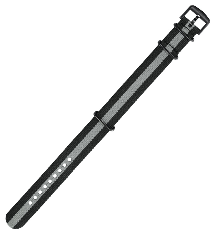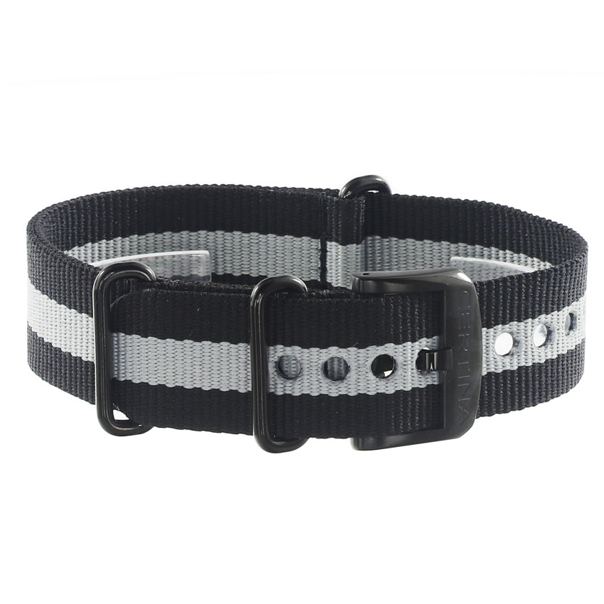 Oryginalny pasek materiałowy NATO C604020494 do zegarków męskich Certina DS Podium Chrono Precidrive. Dedykowany do modeli o numerze serwisowym na deklu, od spodu zegarka C034417, jak i innych zegarków, do których można założyć pasek o szerokości 20 mm. Wykonany z tworzywa sztucznego w kolorze czarnym i szarym, zakończony stalową klamerką w kolorze czarnym z logo Certina.
