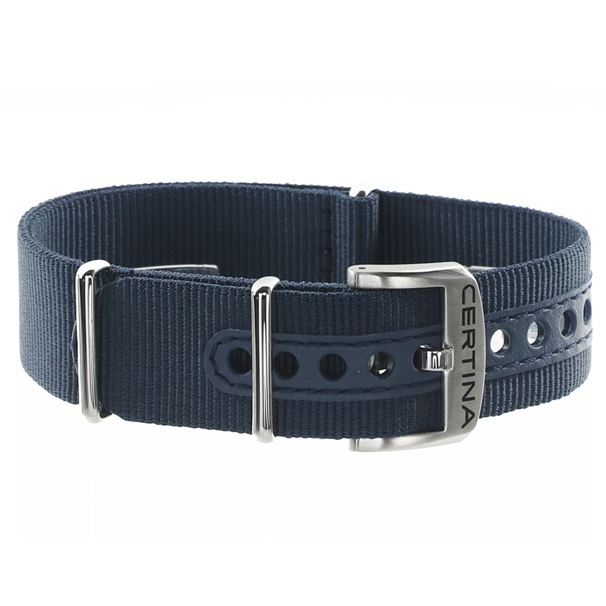 Oryginalny pasek materiałowy NATO do zegarków męskich DS Action GMT Powermatic 80 o numerze serwisowym na deklu, od spodu zegarka C032429, jak i innych modeli, do których można założyć pasek o szerokości 21 mm. Wykonany z tworzywa sztucznego w kolorze niebieskim, zakończony stalową klamerką z logo Certina.