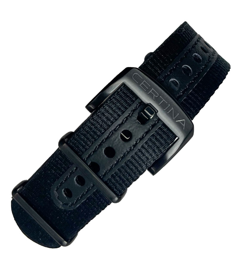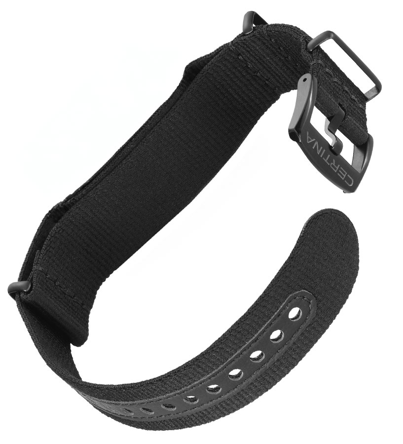 Oryginalny pasek materiałowy NATO do zegarków męskich Certina DS Action Diver o numerze serwisowym na deklu, od spodu zegarka C032607, jak i innych modeli, do których można założyć pasek o szerokości 21 mm. Wykonany z tworzywa sztucznego w kolorze czarnym, zakończony stalową klamerką z logo Certina pokrytą czarną powłoką PVD.