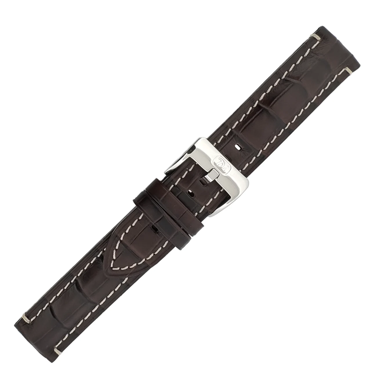 Di-Modell Bali Chrono to sportowy i wytrzymały pasek skórzany o klasycznym odcieniu brązu, zaprojektowany z myślą o zegarkach z dużą kopertą – szczególnie chronografach, modelach lotniczych i nurkowych. Wykonany z wysokiej jakości skóry naturalnej z tłoczeniem inspirowanym skórą aligatora luizjańskiego, łączy ponadczasową estetykę z solidnością wykonania.