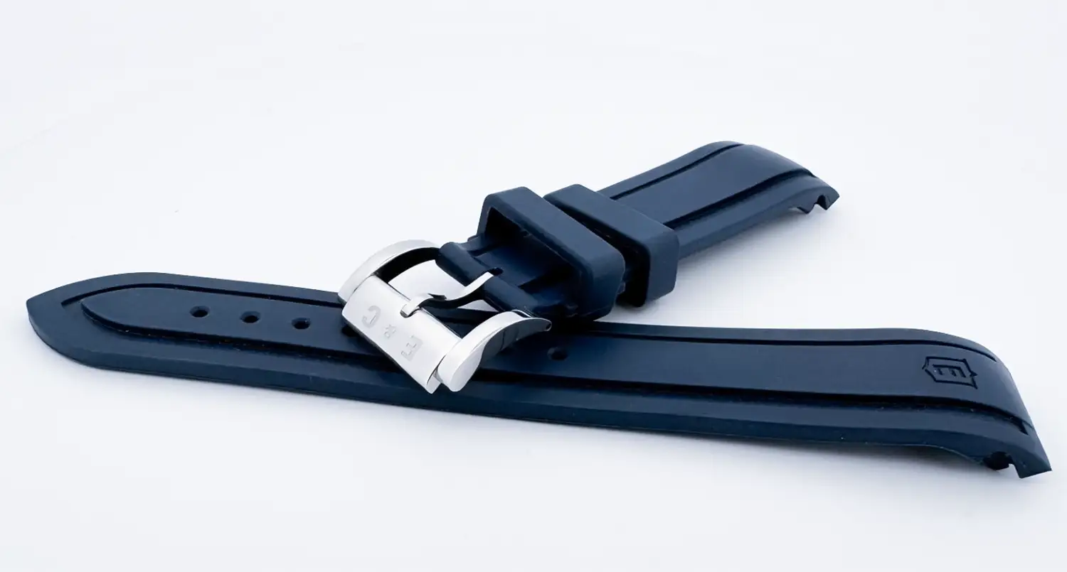 Pasek zakończony jest polerowaną klamerką ze stali szlachetnej, ozdobioną precyzyjnie wygrawerowanym logo marki Eberhard. Klamerka zapewnia pewne i trwałe zapięcie, a przy tym harmonizuje wizualnie z wykończeniem koperty. Elastyczna guma gwarantuje wysoki komfort noszenia, odporność na wilgoć, sól morską i zmienne warunki atmosferyczne.