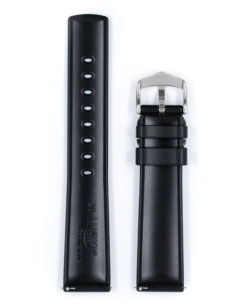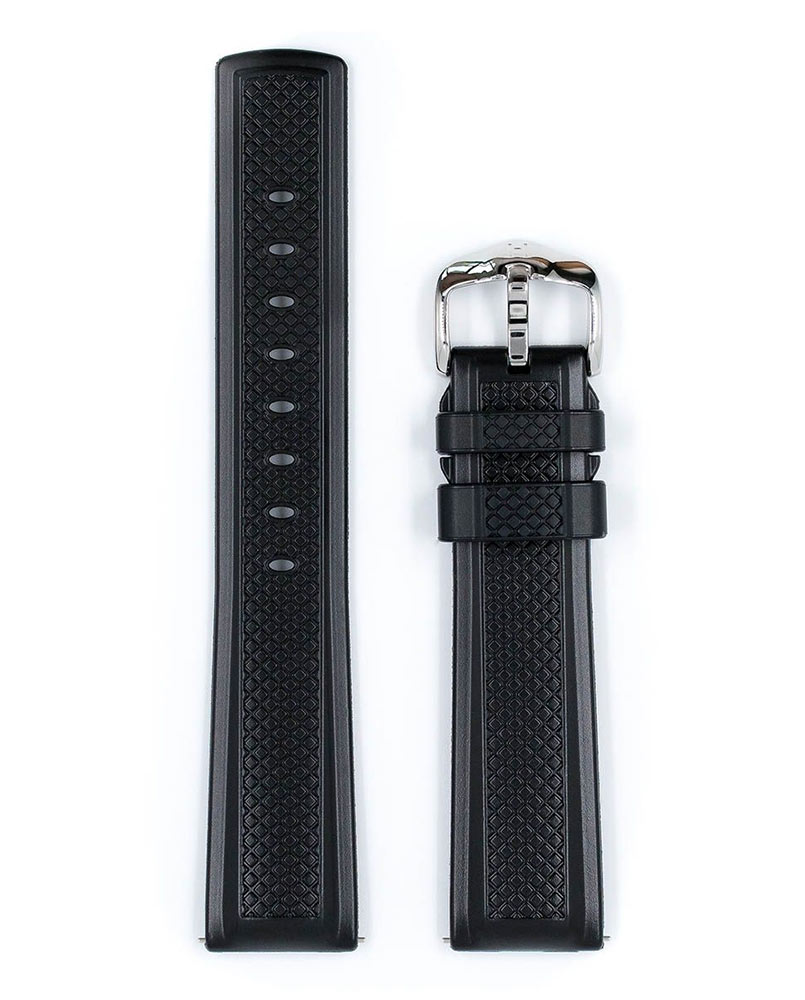 Pasek do zegarka Hirsch Accent kolor czarny — sportowy w motoryzacyjnym stylu z motywem kratki. Wysokogatunkowy kauczuk naturalny został wykończony przez Hirsch w celu uzyskania najlepszego surowca do produkcji funkcjonalnych pasków — ekstremalnie wytrzymały, całkowicie wodoodporny, charakteryzujący się odczuwalnie wyższym komfortem noszenia niż tradycyjne paski syntetyczne. Delikatna wypukłość paska zapewnia skórze odpowiedni dostęp powietrza, a tym samym nie powoduje wytwarzania wilgoci. Zintegrowany system zabezpieczenia szlufki zapobiega przekręcaniu się paska na ręce i wyślizgiwaniu się jej ze szlufki. Całkowicie wodoodporny, odporny na zerwanie i wpływy zewnętrzne takie, jak promieniowanie UV, chemikalia, bardzo wysokie i niskie temperatury, o stabilnej formie. Szczególnie polecany osobom o delikatnej skórze. Zastosowanie teleskopów Quick-Release pozwala na złożenie i ściągnięcie paska bez użycia narzędzi.
