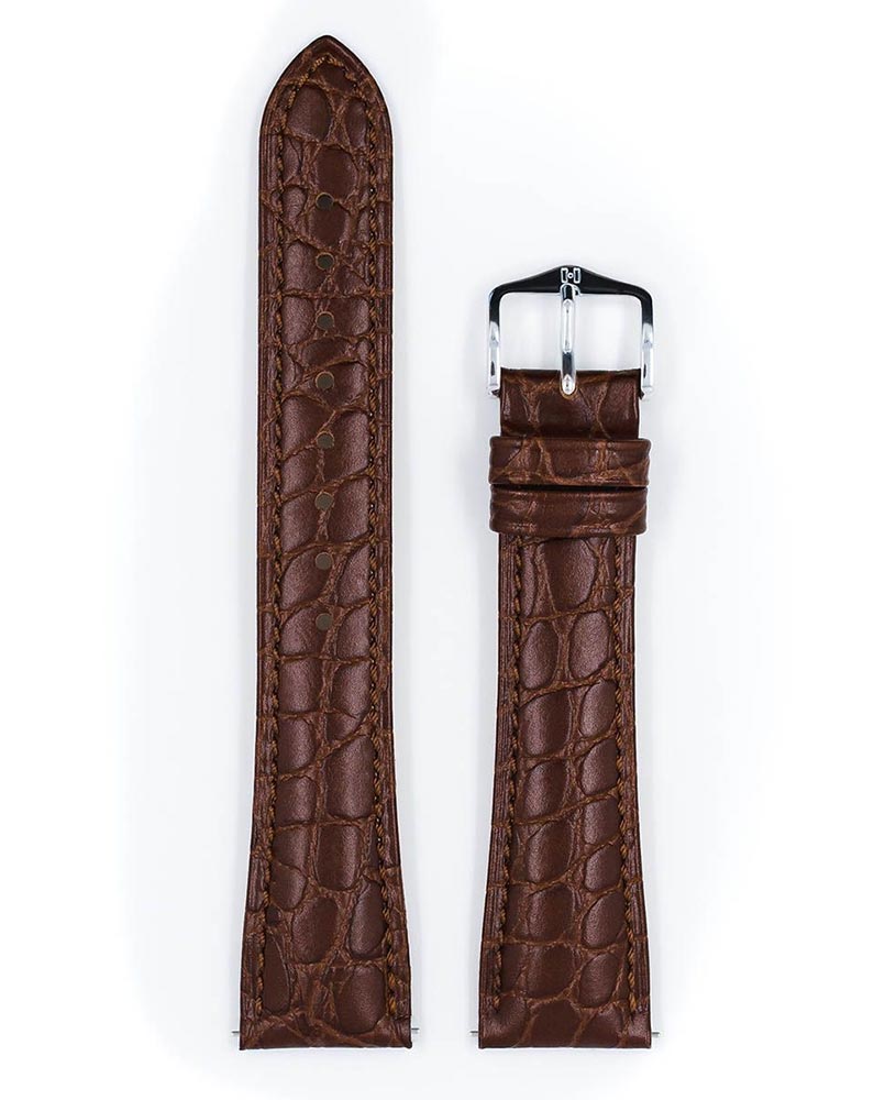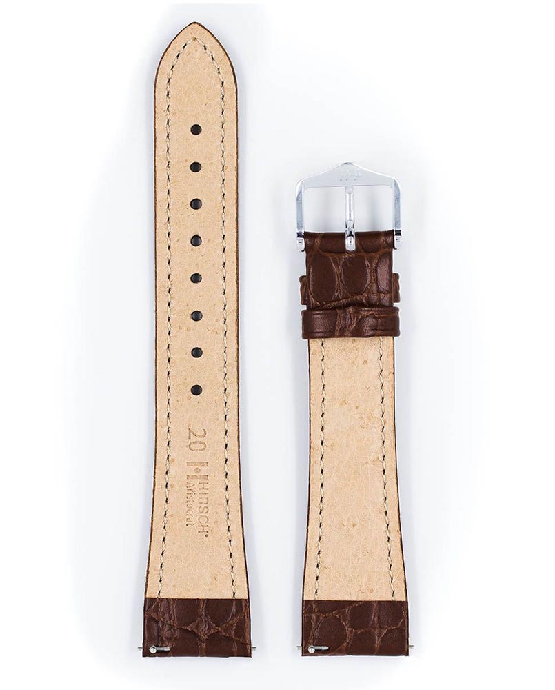 Szlachetny brązowy pasek do zegarka Hirsch Aristocrat o wzorze krokodyla. Matowe wykończenie z wytworną linią i dyskretnym szwem. Lekki materiał wyścielany prawdziwymi włóknami skórzanymi i elegancka klasyczna klamerka. Hirsch Aristocrat idealnie pasuje do damskich i męskich klasycznych zegarków. Specjalne teleskopy ułatwiają montaż paska do zegarka bez użycia narzędzi zegarmistrzowskich.