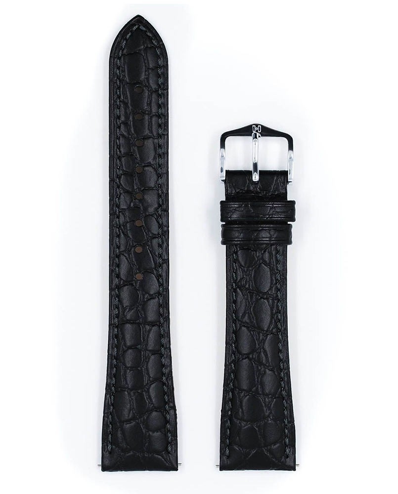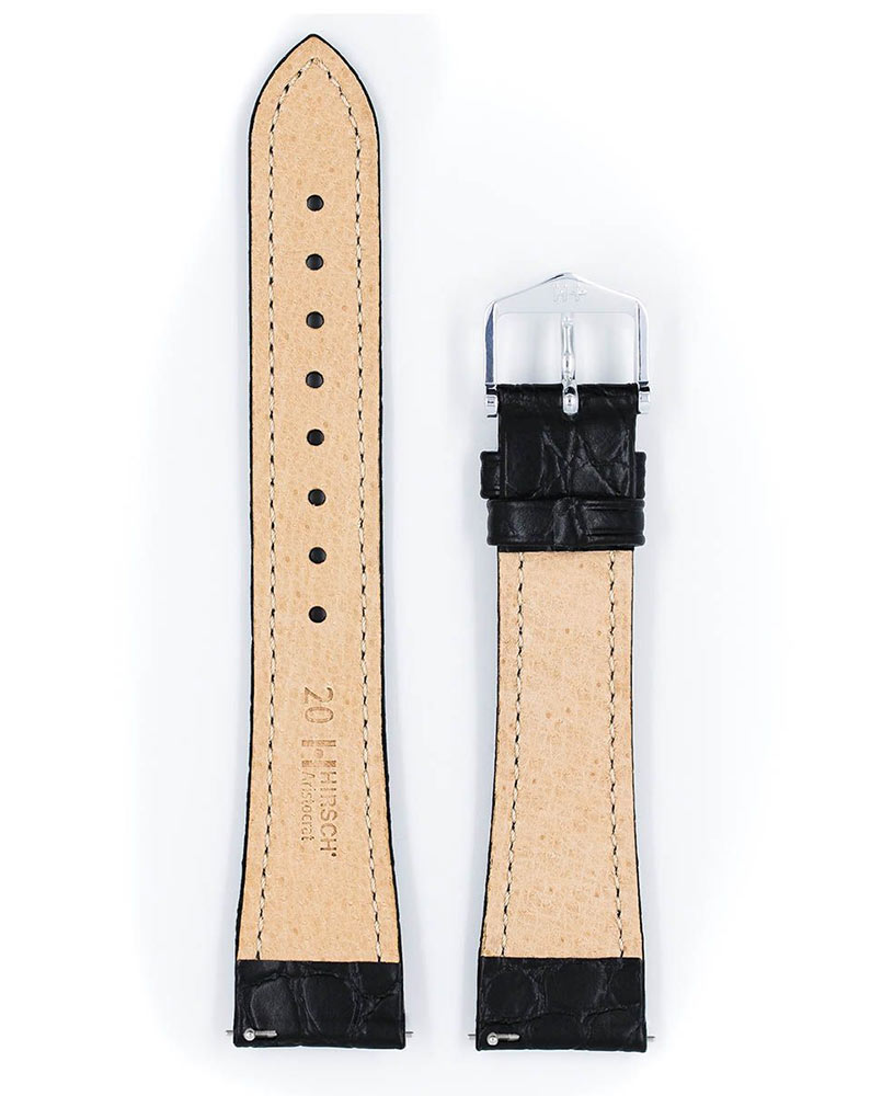 Szlachetny czarny pasek do zegarka Hirsch Aristocrat o wzorze krokodyla. Matowe wykończenie z wytworną linią i dyskretnym szwem. Lekki materiał wyścielany prawdziwymi włóknami skórzanymi i elegancka klasyczna klamerka. Hirsch Aristocrat idealnie pasuje do damskich i męskich klasycznych zegarków. Specjalne teleskopy ułatwiają montaż paska do zegarka bez użycia narzędzi zegarmistrzowskich.
