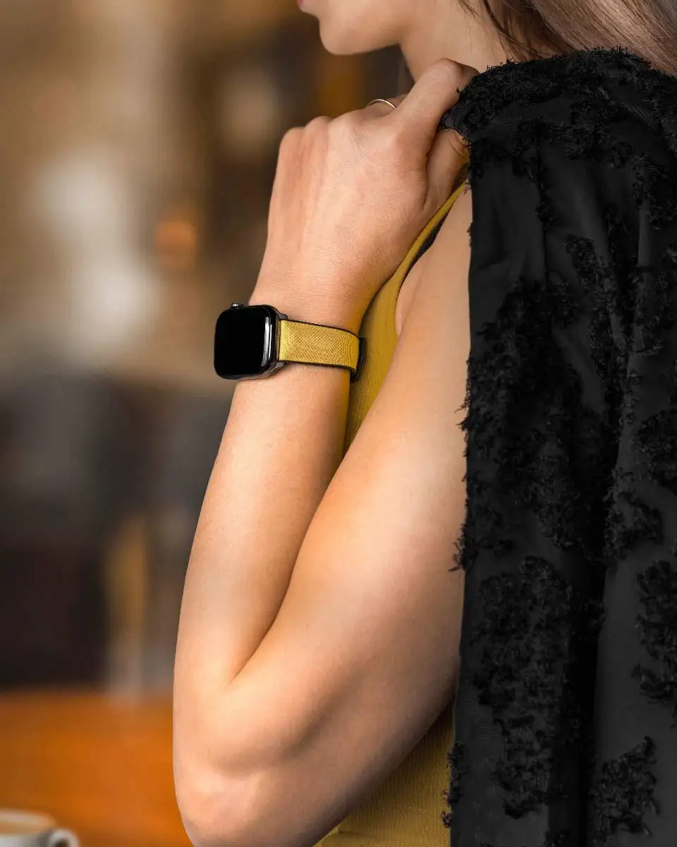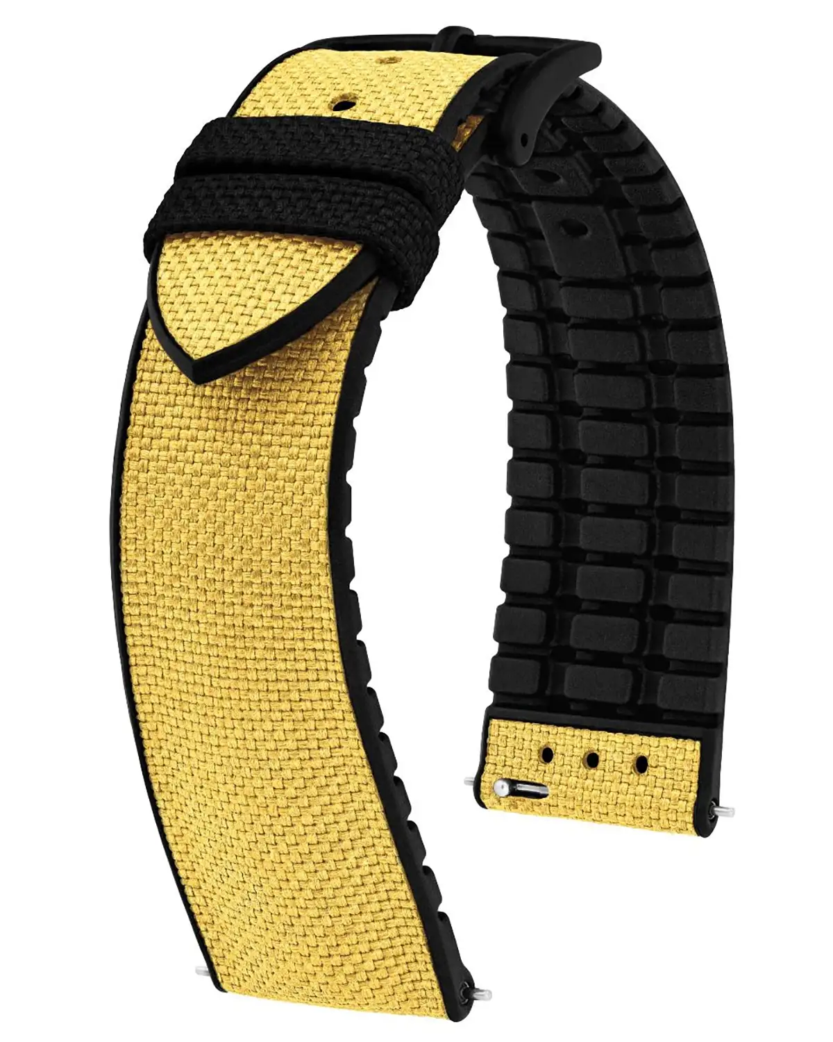 Limitowany pasek do zegarka w kolorze żółtym, wykonany z materiału SEAQUAL® i kauczuku. Wodoodporny, wegański, z czarną klamerką i szlufkami – dostępny tylko w kilku egzemplarzach.