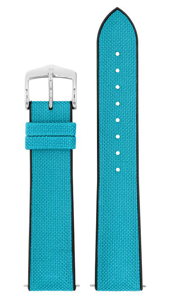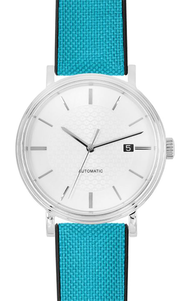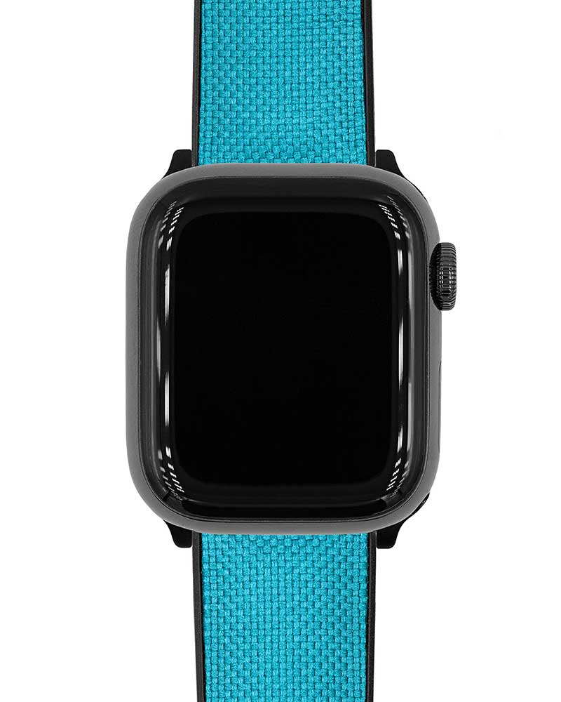 Sportowo elegancki pasek do zegarka w kolorze turkusowym. W pełni wegański oraz wodoodporny ze specjalnym kauczukowym spodem, który odprowadza wodę, wilgoć z ręki podczas noszenia.