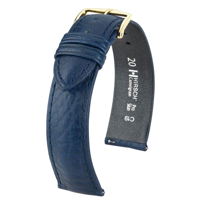 Hirsch Camelgrain pasek do zegarka w kolorze niebieskim. Największy komfort noszenia nawet dla osoby o wrażliwej skórze. Opracowana we współpracy z Department of Vienna Dermatological University Clinic specjalna podszewka Pro Skin (spodnia część paska) zapewnia właściwości hipoalergiczne specjalnie dla alergików.