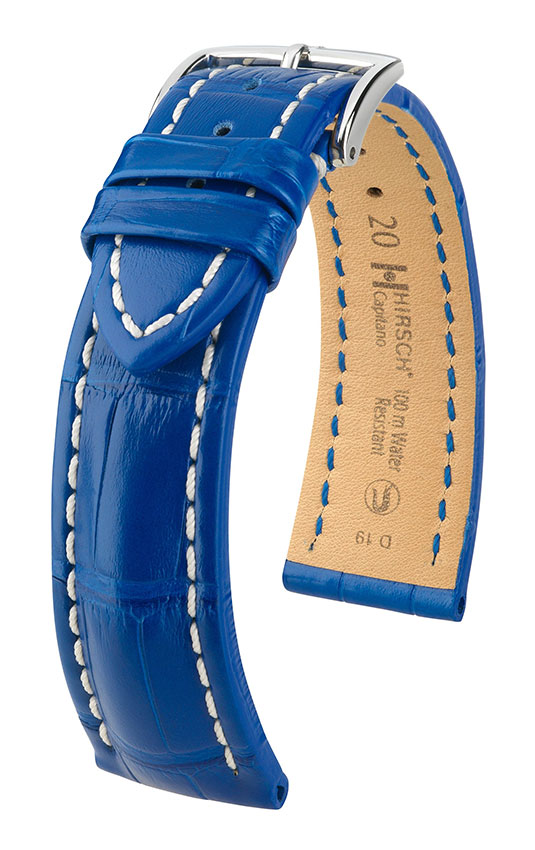 Ekskluzywny pasek do zegarka wykonany ze skóry aligatora w wersji półmatowej Hirsch Capitano kolor błękit królewski. Elegancki i sportowy zarazem. Kształt paska zapewnia silny i atletyczny charakter, który idealnie będzie nadawał się do masywnych, sportowych zegarków. Idealny towarzysz dla obszernych zegarków. Wykonany z najwyższej jakości skóry aligatora luizjańskiego dodaje namacalnej siły.