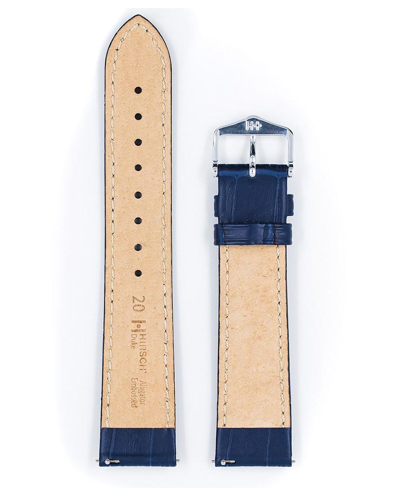 Jeden z najpopularniejszych na świecie pasków do zegarków Hirsch Duke w kolorze niebieskim. Austriacki producent przez stulecia udoskonala sztukę rzemieślniczą obróbki skór, czego owocem jest wyjątkowo wytrzymała, naturalna skóra, która łączy elegancki i ekskluzywny wzór aligatora z ekstremalną wytrzymałością. Odporna na działanie wody i potu skóra podszewkowa Hirsch Softglove zapewnia najwyższy komfort noszenia także przy narażaniu jej na większe obciążenia. Teleskopy Hirsch Quick-Release zamontowane w pasku umożliwiają jego założenie do zegarka bez użycia narzędzi. Model Duke idealnie komponuje się z eleganckimi i sportowymi zegarkami. Niebieski pasek do zegarka Hirsch Duke dostępny jest w szerokościach: 12 mm, 14 mm, 16 mm, 18 mm, 20 mm, 22 mm i 24 mm.