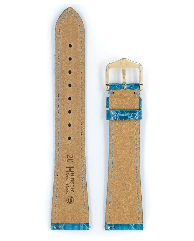 Hirsch Genuine Croco to ekskluzywny pasek do zegarka w kolorze turkusowym. Wykonany ze skóry krokodyla, ponadczasowy klasyczny materiał dla ekskluzywnych zegarków. Starannie wybierana, drogocenna skóra krokodyla wykończona na wysoki połysk. Delikatny z wyglądu pasek z drobnym szwem i elastyczną skórą podszewkową, która nadaje lekkość, miękkość i elastyczność. Skórzana bransoletka jest poddawana ręcznej obróbce, głęboko barwiona i wykonana z boków krokodyla południowoamerykańskiego. Charakteryzuje się typową strukturą powierzchni w formie siatki złożonej z większych i mniejszych łusek. Zastosowanie specjalnych teleskopów pozwala na zamontowanie i ściągnięcie paska bez użycia narzędzi. Hirsch Genuine Croco dostępny jest w rozmiarach 12 mm, 13 mm, 14 mm, 15 mm, 16 mm, 17 mm, 18 mm, 19 mm, 20 mm i 22 mm.
