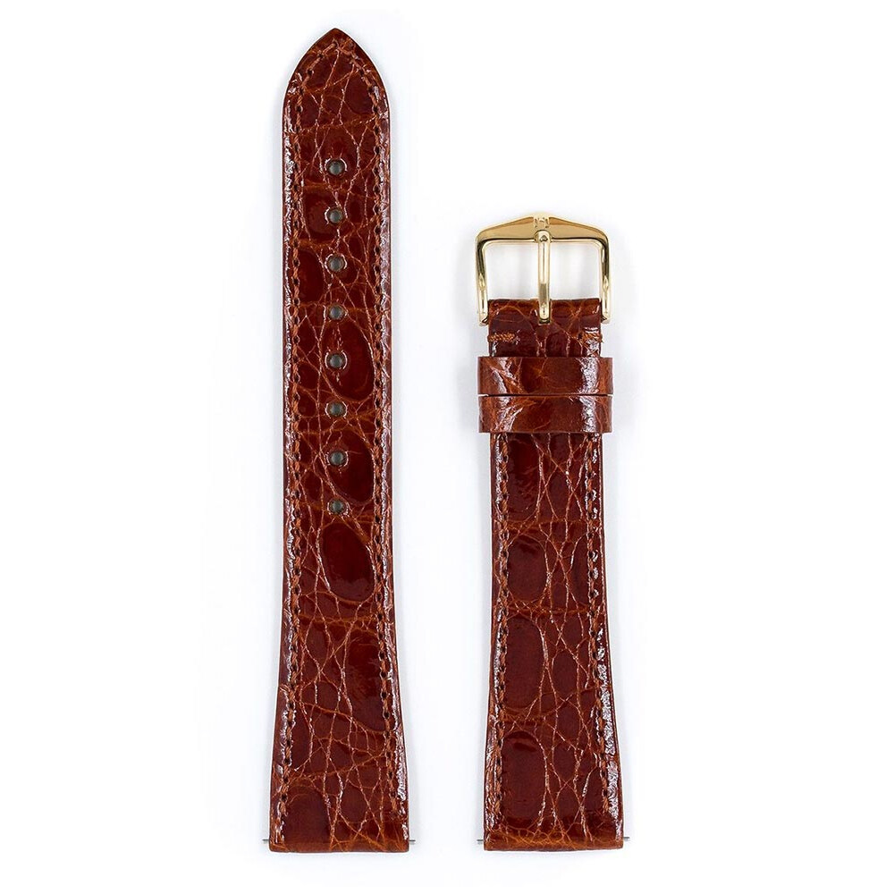 Hirsch Genuine Croco to ekskluzywny pasek do zegarka w kolorze złotobrązowym. Wykonany ze skóry krokodyla, ponadczasowy klasyczny materiał dla ekskluzywnych zegarków. Starannie wybierana, drogocenna skóra krokodyla wykończona na wysoki połysk. Delikatny z wyglądu pasek z drobnym szwem i elastyczną skórą podszewkową, która nadaje lekkość, miękkość i elastyczność. Skórzana bransoletka jest poddawana ręcznej obróbce, głęboko barwiona i wykonana z boków krokodyla południowoamerykańskiego. Charakteryzuje się typową strukturą powierzchni w formie siatki złożonej z większych i mniejszych łusek. Zastosowanie specjalnych teleskopów pozwala na zamontowanie i ściągnięcie paska bez użycia narzędzi. Hirsch Genuine Croco dostępny jest w rozmiarach 12 mm, 13 mm, 14 mm, 15 mm, 16 mm, 17 mm, 18 mm, 19 mm, 20 mm i 22 mm.
