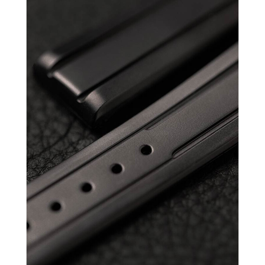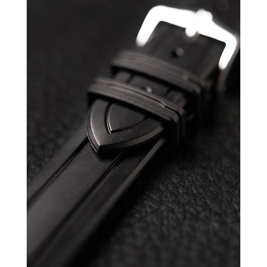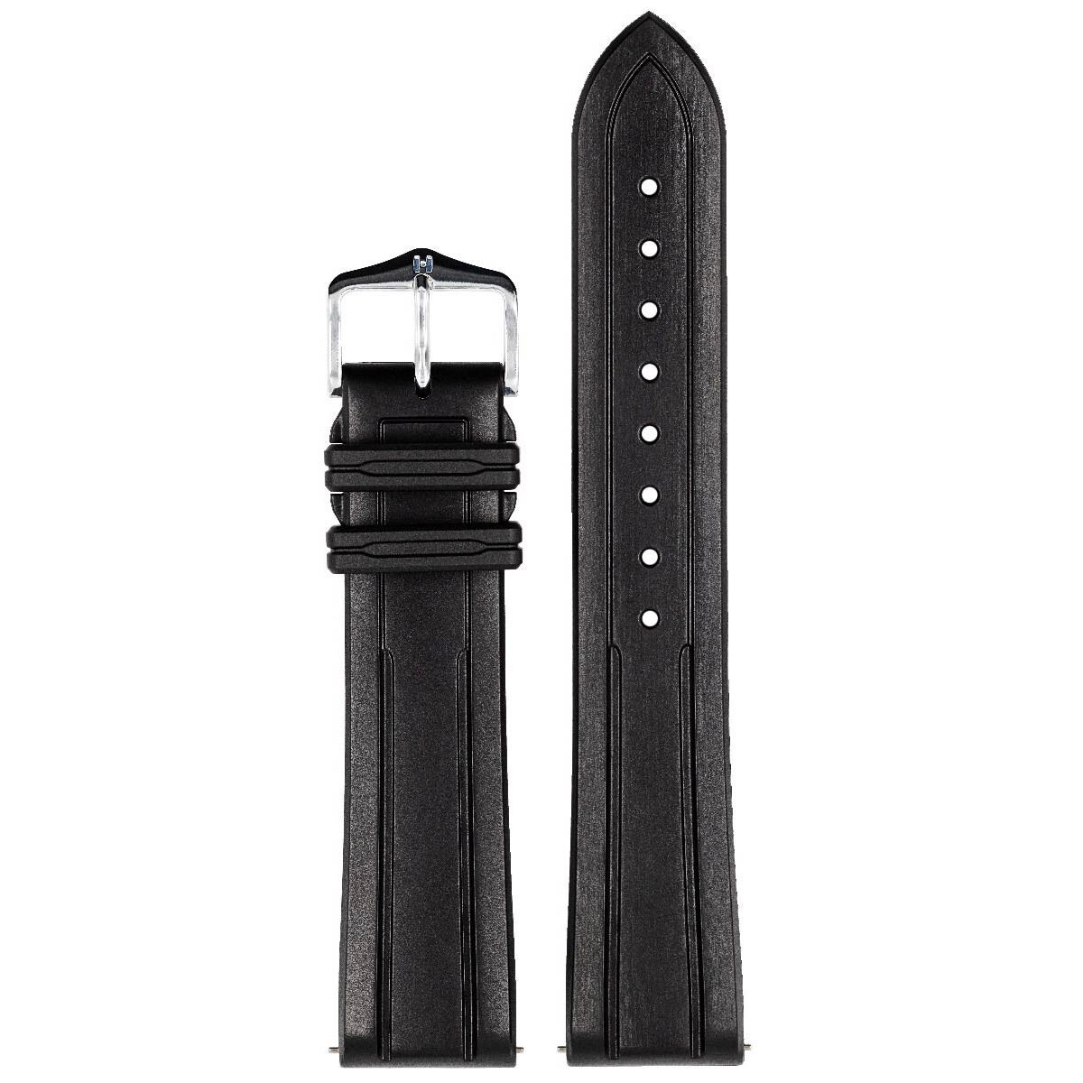 Pasek do zegarka Hirsch Hevea kolor czarny — wysoka technologia w eleganckiej oprawie. Kauczuk HIRSCH Premium jest całkowicie odporny na działanie wody i innych czynników zewnętrznych, a przy tym jest znacznie bardziej miękki niż tradycyjne materiały syntetyczne. Lekko wygięta wewnętrzna strona paska zapobiega przyleganiu do nadgarstka, zapewniając optymalną cyrkulację powietrza i najwyższy komfort noszenia. Zintegrowany z paskiem system unieruchamiania szlufki zatrzymuje szlufkę na swoim miejscu, dzięki czemu się nie przemieszcza. Quick-Release System pozwala na mocowanie bez dodatkowych teleskopów. Wystarczy przesunąć wystający od spodu element teleskopu, aby można było wsunąć pasek do koperty i założyć bez użycia narzędzi.