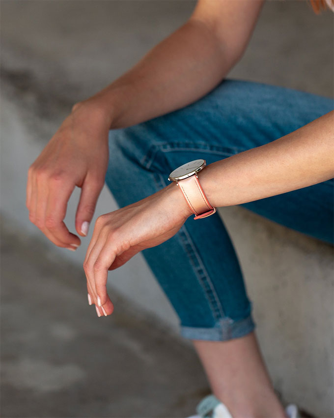 Rodzaj materiału, z którego wykonano pasek. Dostępne są m.in. paski skórzane (różne gatunki), gumowe, tekstylne lub wykonane z kauczuku. Materiał wpływa na komfort noszenia, estetykę i przeznaczenie zegarka.