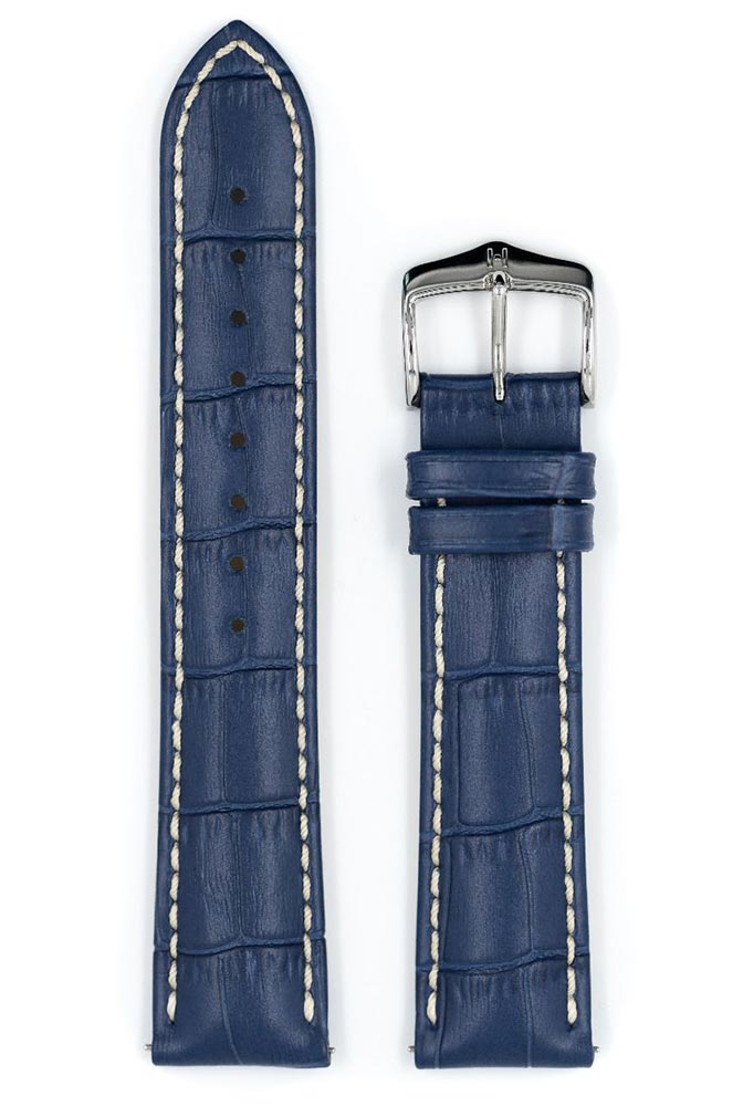 Pasek do zegarka Hirsch Modena w kolorze niebieskim, wykonany z wysokogatunkowej skóry cielęcej garbowanej przez włoskich mistrzów w sposób nadający jej właściwości wodoodporne. Wykończenie i odwzorowanie naturalnej struktury aligatora. Odporna na działanie wody i potu skóra podszewkowa jest łączona ze skórą wierzchnią za pomocą najnowszej technologii firmy Hirsch. Dzięki temu ten dostępny w wielu kolorach pasek zachowuje niesamowitą wytrzymałość przy jednoczesnym bardzo wysokim komforcie noszenia. Zastosowanie szybkich teleskopów pozwala na założenie Modeny bez użycia narzędzi.
