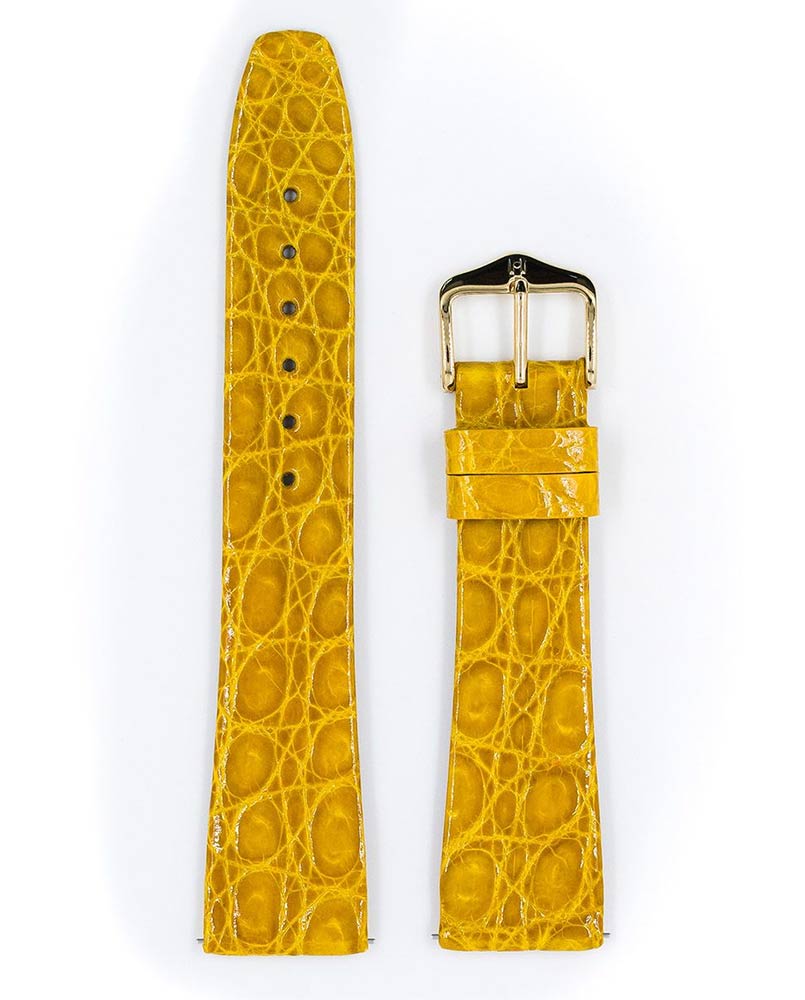 Wysokiej jakości pasek wykonany z krokodyla południowoamerykańskiego Hirsch Prestige kolor żółty. Perełka dla perfekcjonistów, dla których estetyka ma kluczowe znaczenie. Szlachetny pasek, który będzie doskonale pasował do tradycyjnych zegarków.