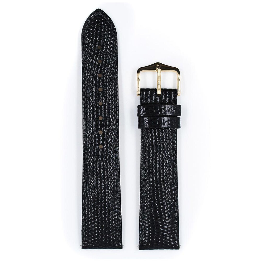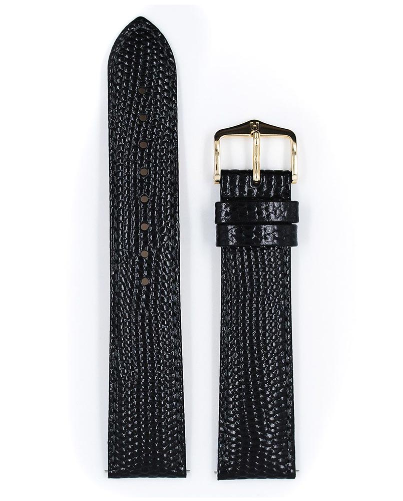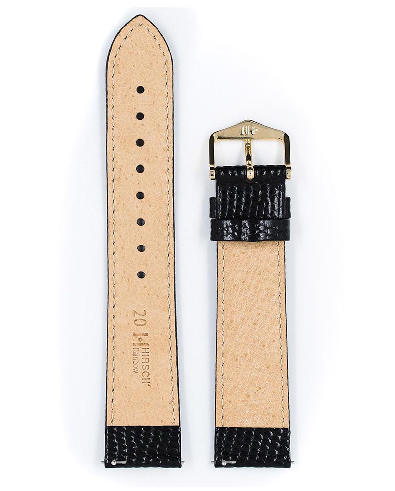 Hirsch Rainbow pasek do zegarka w kolorze czarnym. Klasyczny design w mistrzowskim wykonaniu. Niesamowicie lekki i przyjemny w noszeniu pasek o wzorze jaszczurki, któremu nie sposób się oprzeć. Cielęca skóra o jedwabistym blasku z wyrazistym wytłoczeniem odwzorowującym skórę jaszczurki i gęsto ułożonymi, lekko uniesionymi łuskami. Rainbow dostępny jest w klasycznych kolorach jak i w jasnych barwach, dzięki czemu można go założyć do każdego męskiego jak i damskiego zegarka. Zastosowanie szybkich teleskopów umożliwia założenie paska bez użycia narzędzi i ściągnięcie jednym ruchem.