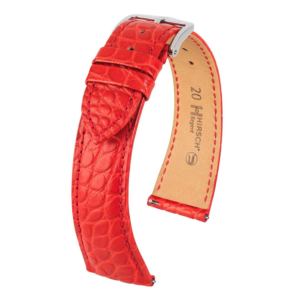 Pasek do zegarka Hirsch Regent kolor czerwony emanujący klasycznym pięknem. Wykonany z bocznej części skóry aligatora z małymi okrągłymi wzorami, które dodają szlachetnego charakteru. Największy komfort noszenia zapewniony jest przez miękkość, elastyczność skóry odpornej na wodę i pot oraz zapinka ze stali szlachetnej niezawierająca niklu. Idealna propozycja do prestiżowych, eleganckich zegarków. Zastosowanie specjalnych teleskopów pozwala na zamontowanie i ściągnięcie paska bez użycia narzędzi. Hirsch Regent dostępny jest w rozmiarach 16 mm, 17 mm, 18 mm, 19 mm i 20 mm.