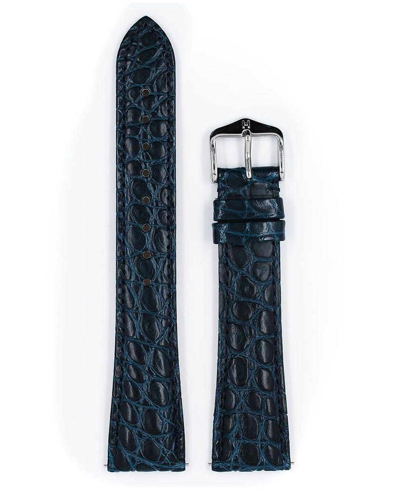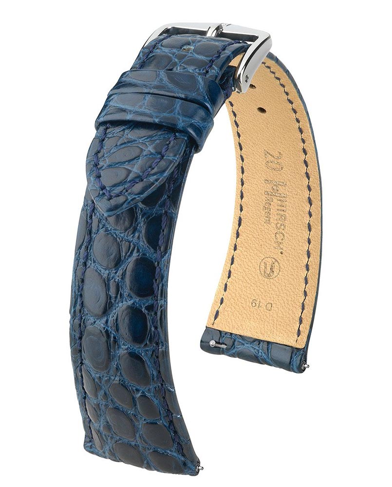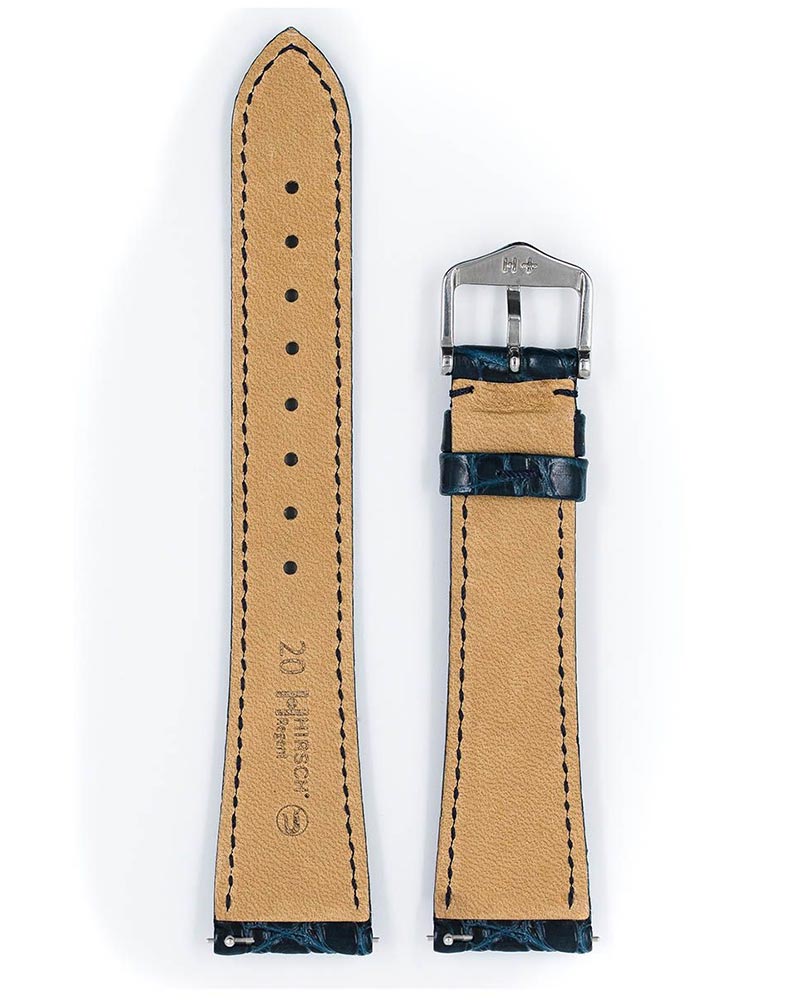 Pasek do zegarka Hirsch Regent kolor niebieski emanujący klasycznym pięknem. Wykonany z bocznej części skóry aligatora z małymi okrągłymi wzorami, które dodają szlachetnego charakteru. Największy komfort noszenia zapewniony jest przez miękkość, elastyczność skóry odpornej na wodę i pot oraz zapinka ze stali szlachetnej niezawierająca niklu. Idealna propozycja do prestiżowych, eleganckich zegarków. Zastosowanie specjalnych teleskopów pozwala na zamontowanie i ściągnięcie paska bez użycia narzędzi. Hirsch Regent dostępny jest w rozmiarach 16 mm, 17 mm, 18 mm, 19 mm i 20 mm.