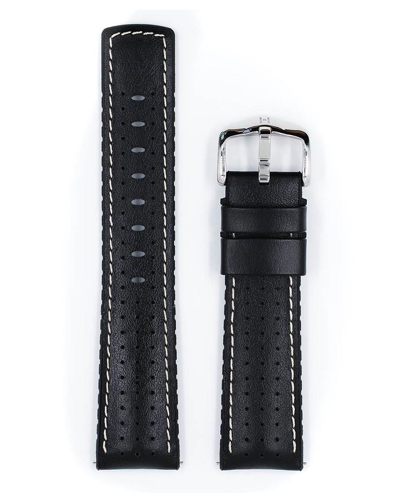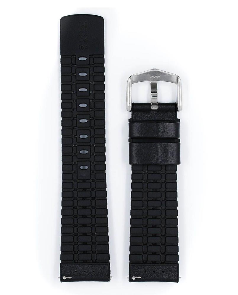 Hirsch Tiger pasek do zegarka kolor czarny. Od spodu pasek jest wykonany z najwyższej jakości kauczuku Hirsch Premium Caoutchouc, który zapewnia wodoodporność. Specjalnie zaprojektowane rowki odprowadzają wodę i wilgoć, zapewniając niezrównany komfort noszenia. Odpowiedni wybór na każdą okazję. Estetycznie piękny, jedwabiście miękki i równocześnie niezmiernie funkcjonalny sportowy pasek do zegarka z wytrzymałej skóry wierzchniej ze sportową, kontrastową nitką. Doskonały towarzysz na co dzień i podczas uprawiania sportu. Tiger jest wyposażony w specjalne teleskopy, które umożliwiają montaż bez użycia narzędzi.