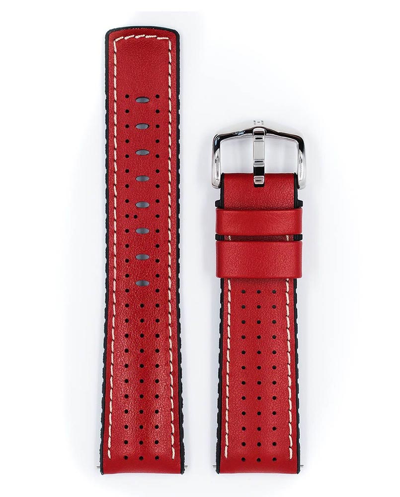 Wodoodporny pasek do zegarka wykonany ze skóry i kauczuku. Czerwony kolor kontrastuje z białą nicią i dodaje sportowego charakteru.