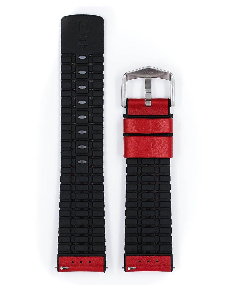 Hirsch Tiger pasek do zegarka kolor czerwony. Od spodu pasek jest wykonany z najwyższej jakości kauczuku Hirsch Premium Caoutchouc, który zapewnia wodoodporność. Specjalnie zaprojektowane rowki odprowadzają wodę i wilgoć, zapewniając niezrównany komfort noszenia. Odpowiedni wybór na każdą okazję. Estetycznie piękny, jedwabiście miękki i równocześnie niezmiernie funkcjonalny sportowy pasek do zegarka z wytrzymałej skóry wierzchniej ze sportową, kontrastową nitką. Doskonały towarzysz na co dzień i podczas uprawiania sportu. Tiger jest wyposażony w specjalne teleskopy, które umożliwiają montaż bez użycia narzędzi.