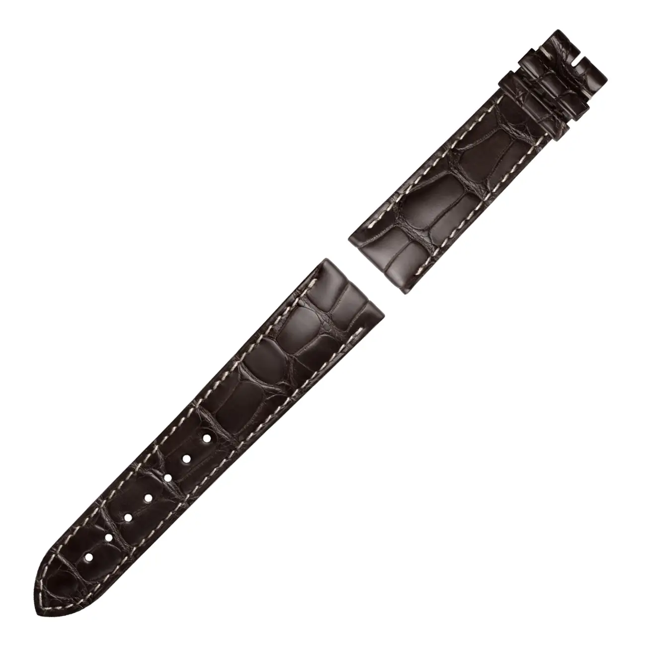 Oryginalny pasek Longines Master Collection wykonany jest z aligatora w głębokim, matowym odcieniu brązu. Kontrastowe przeszycia w kolorze ecru podkreślają elegancki charakter paska i harmonijnie współgrają z wyrafinowaną stylistyką zegarków Longines z tej linii. Delikatna faktura skóry oraz staranne, precyzyjne wykończenie sprawiają, że pasek prezentuje się szlachetnie i klasycznie – bez zbędnego połysku.