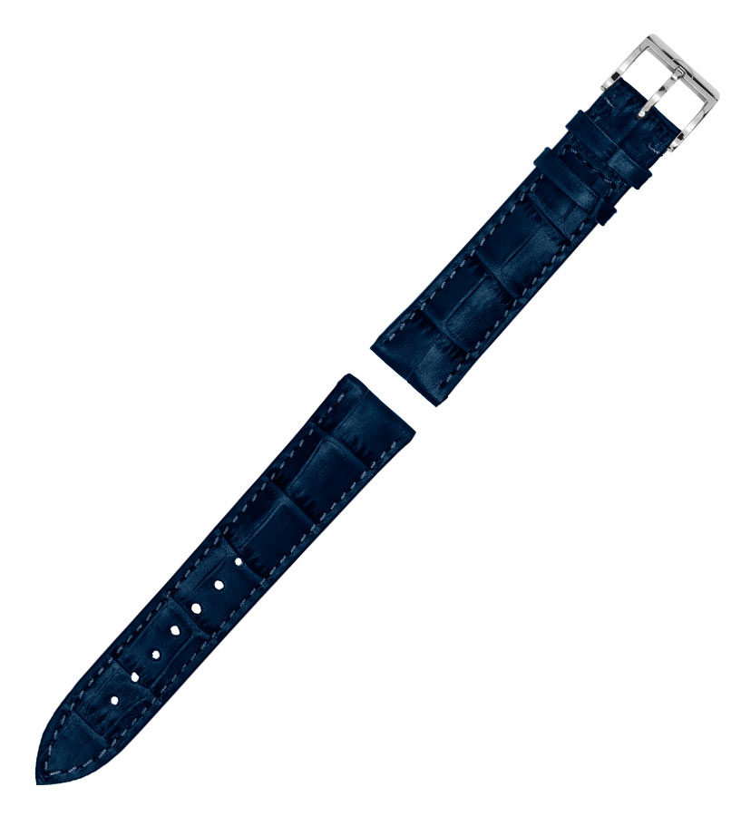 Oryginalny pasek do zegarków MeisterSinger. Wykonany ze skóry naturalnej w kolorze niebieskim o eleganckim wzorze aligatora. Pasek jest przeszyty niebieską nicią oraz zakończony stalową, polerowaną na wysoki połysk klamerką z logo marki.