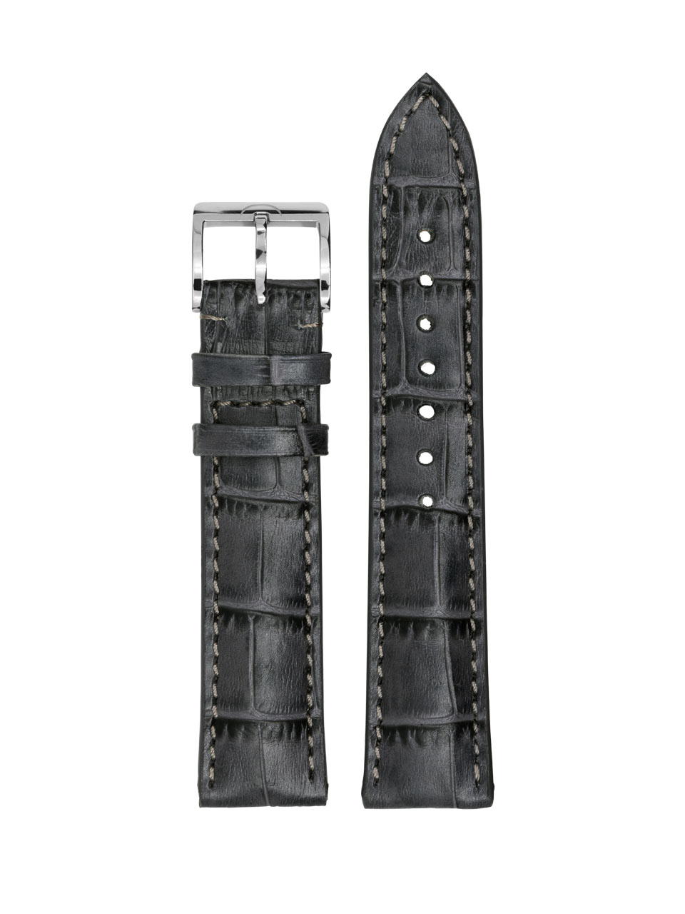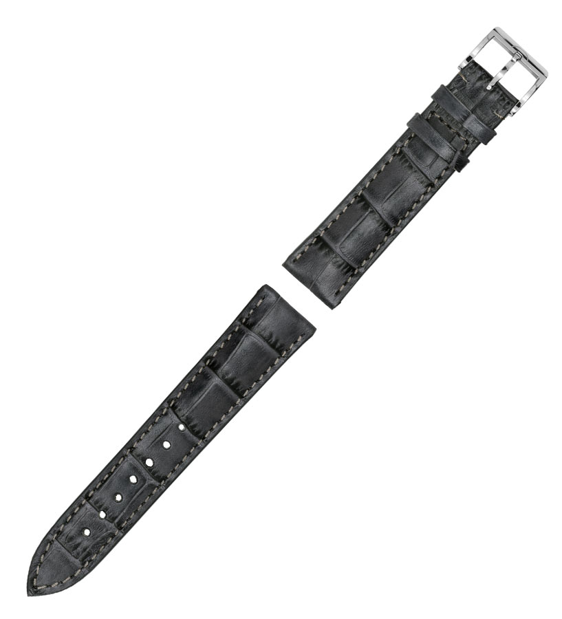 Oryginalny pasek do zegarków MeisterSinger. Wykonany ze skóry naturalnej w kolorze szarym o eleganckim wzorze aligatora. Pasek jest przeszyty szarą nicią oraz zakończony stalową, polerowaną na wysoki połysk klamerką z logo marki.