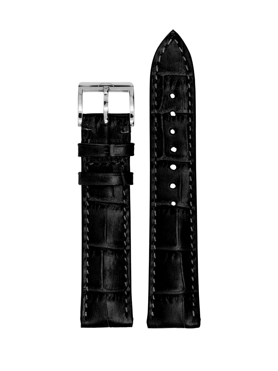 Oryginalny pasek do zegarków MeisterSinger. Wykonany ze skóry naturalnej w kolorze czarnym o eleganckim wzorze aligatora. Pasek jest przeszyty czarną nicią oraz zakończony stalową, polerowaną na wysoki połysk klamerką z logo marki.
