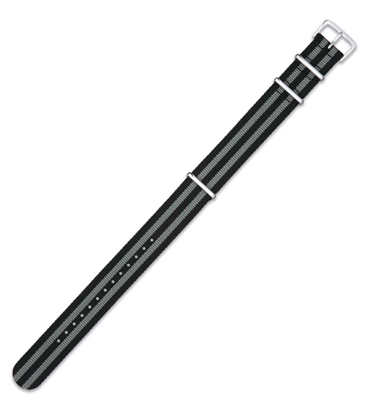 Tekstylny, nylonowy pasek do zegarka w stylu NATO. Kolor czarny z dwoma szarymi pasami. Idealnie komponuje się ze sportowymi, wojskowymi lub zegarkami w stylu retro. Pasek NATO powstał specjalnie dla wojska, aby sprostać trudnym warunkom podczas misji. Odznacza się lekkością, wodoodpornością i wytrzymałością. Można w nim pływać, nurkować, wytrzyma ekstremalne warunki pod wodą i na powierzchni. Pasek NATO dostępny jest w rozmiarze 18 mm, 20 mm oraz 22 mm, który należy wybrać podczas składania zamówienia.