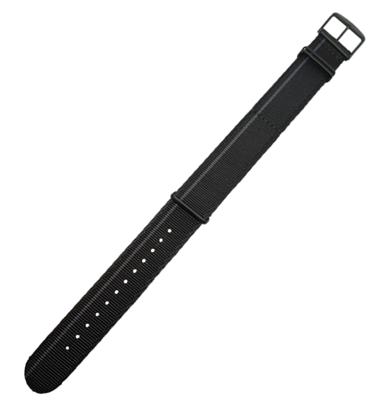 Oryginalny, materiałowy pasek NATO Traser 107805 w kolorze czarnym z szarym akcentem, szerokości 24 mm. Wygodny noszeniu, wodoodporny, idealny na letnie gorące dni. Zakończony stalową klamerką w kolorze czarnym, w zestawie znajdują się teleskopy umożliwiające montaż paska.