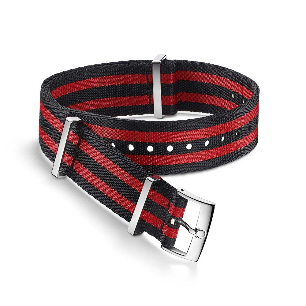 Oryginalny pasek OMEGA NATO do zegarków Omega. Wykonany z Poliamidu, tworzywa sztucznego, który jest bardzo wytrzymały i wodoodporny. Czarne pasy przeplatane czerwonymi idealnie pasują do Omegi Speedmaster i Omega Seamaster. Błyszczące, wykonane ze stali szlachetnej szlufki i klamerka Omegi. Zgodnie ze specyfikacją producenta pasek o szerokości np. 20 mm będzie także pasował do rozstawu 19 mm, w ten sposób można je dopasować aż do czterech szerokości: 19 mm, 20 mm i 21 mm, 22 mm. Długość całkowita 313 mm. Idealna propozycja na wiosnę i lato, zmień charakter swojego zegarka Omega i ciesz się komfortem noszenia.