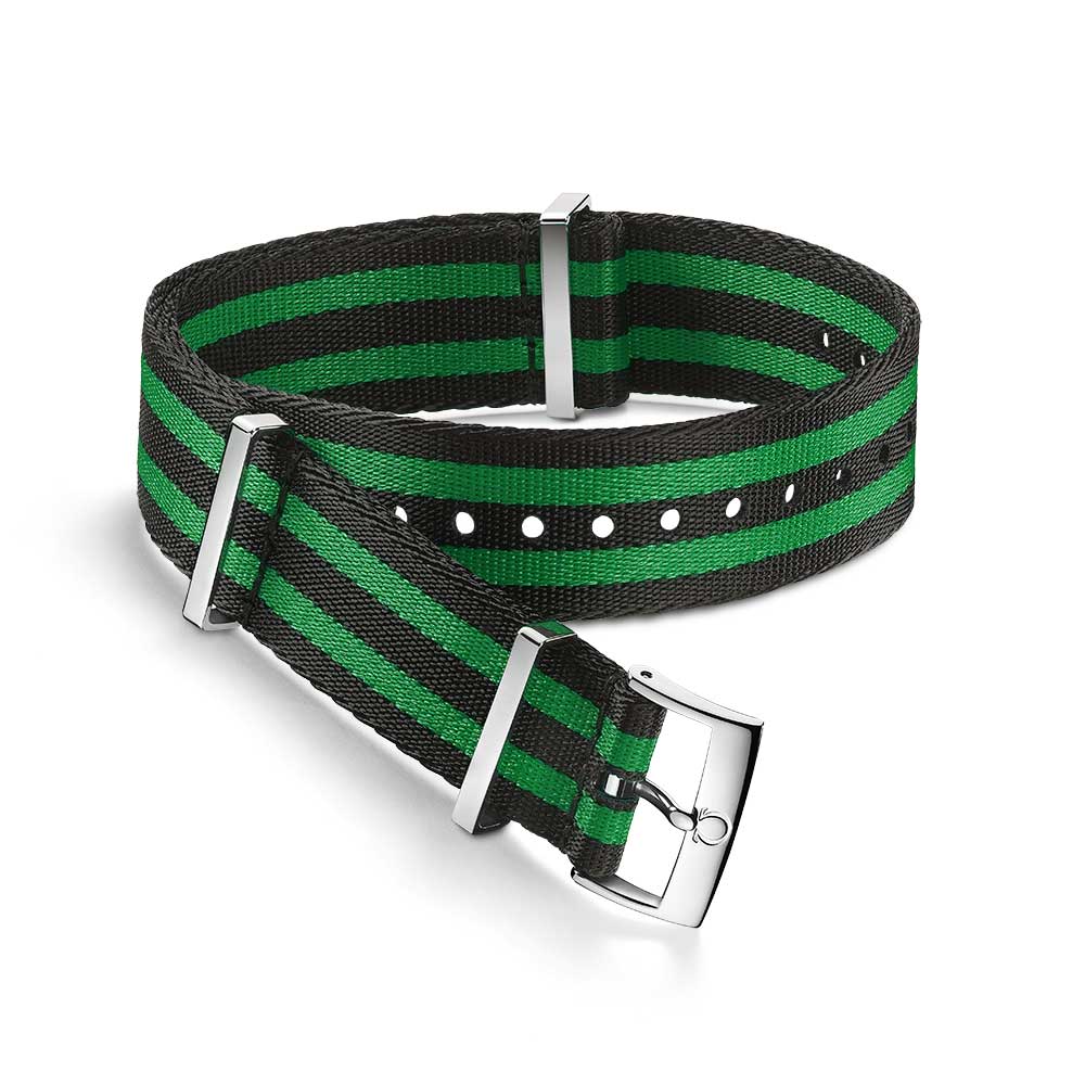 Oryginalny pasek OMEGA NATO do zegarków Omega. Wykonany z Poliamidu, tworzywa sztucznego, który jest bardzo wytrzymały i wodoodporny. Czarne pasy przeplatane zielonymi idealnie pasują do Omegi Speedmaster i Omega Seamaster. Błyszczące, wykonane ze stali szlachetnej szlufki i klamerka Omegi. Zgodnie ze specyfikacją producenta pasek o szerokości np. 20 mm będzie także pasował do rozstawu 19 mm, w ten sposób można je dopasować aż do czterech szerokości: 19 mm, 20 mm i 21 mm, 22 mm. Długość całkowita 313 mm. Idealna propozycja na wiosnę i lato, zmień charakter swojego zegarka Omega i ciesz się komfortem noszenia.