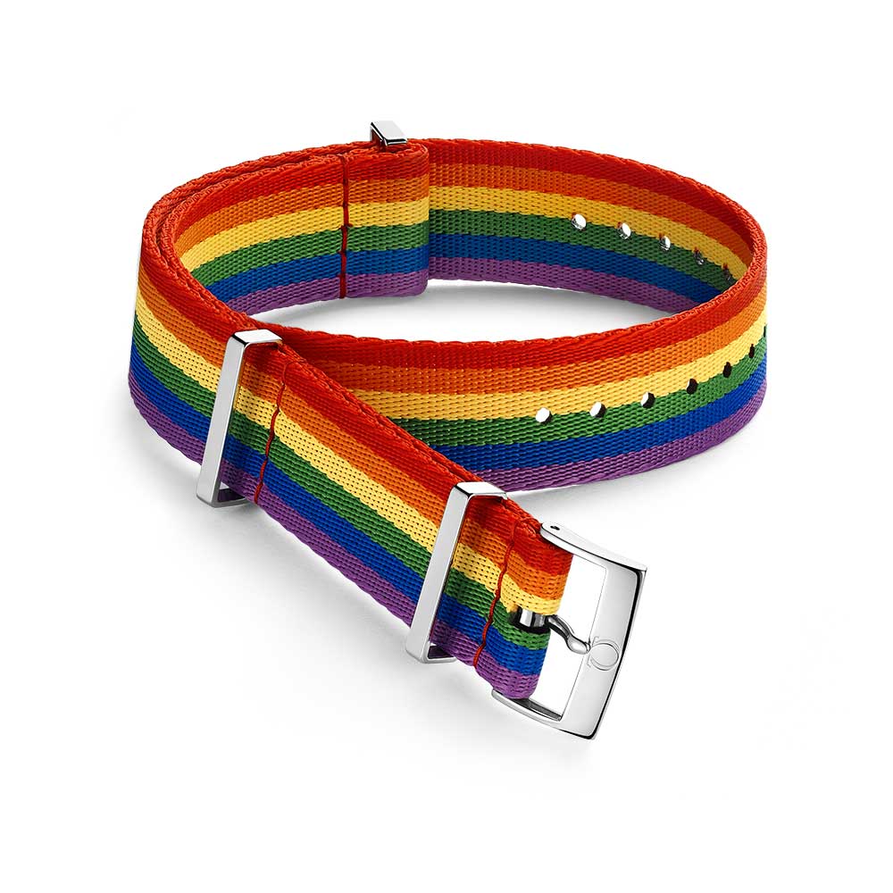 Oryginalny pasek OMEGA NATO do zegarków Omega. Wykonany z Poliamidu, tworzywa sztucznego, który jest bardzo wytrzymały i wodoodporny. Kolorowe pasy w barwach tęczy idealnie pasują do Omegi Speedmaster i Omega Seamaster. Błyszczące, wykonane ze stali szlachetnej szlufki i klamerka Omegi. Zgodnie ze specyfikacją producenta pasek o szerokości np. 20 mm będzie także pasował do rozstawu 19 mm, w ten sposób można je dopasować aż do czterech szerokości: 19 mm, 20 mm i 21 mm, 22 mm. Długość całkowita 313 mm. Idealna propozycja na wiosnę i lato, zmień charakter swojego zegarka Omega i ciesz się komfortem noszenia.
