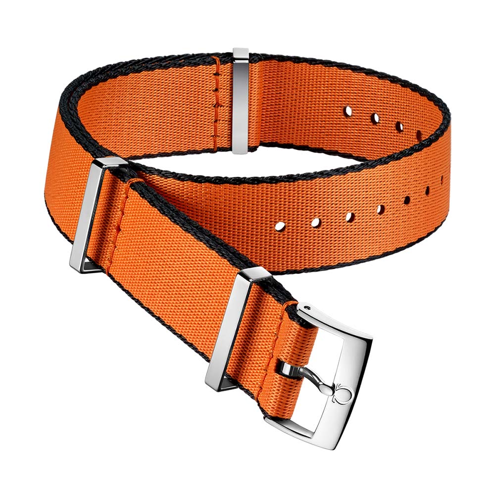 Oryginalny pasek w stylu NATO do zegarków Omega. Wykonany z Poliamidu, miękkiego i wygodnego w noszeniu tworzywa sztucznego, który jest bardzo wytrzymały i wodoodporny. Kolor pomarańczowy z czarnymi bokami idealnie pasuje do sportowych modeli Omegi Speedmaster, czy Omega Seamaster. Polerowane na wysoki połysk, wykonane ze stali szlachetnej szlufki i klamerka Omegi. Zgodnie ze specyfikacją producenta pasek o szerokości np. 20 mm będzie także pasował do rozstawu 19 mm, w ten sposób można je dopasować aż do czterech szerokości: 19 mm, 20 mm i 21 mm, 22 mm. Długość całkowita 313 mm. Idealna propozycja na wiosnę i lato, zmień charakter swojego zegarka Omega i ciesz się komfortem noszenia.