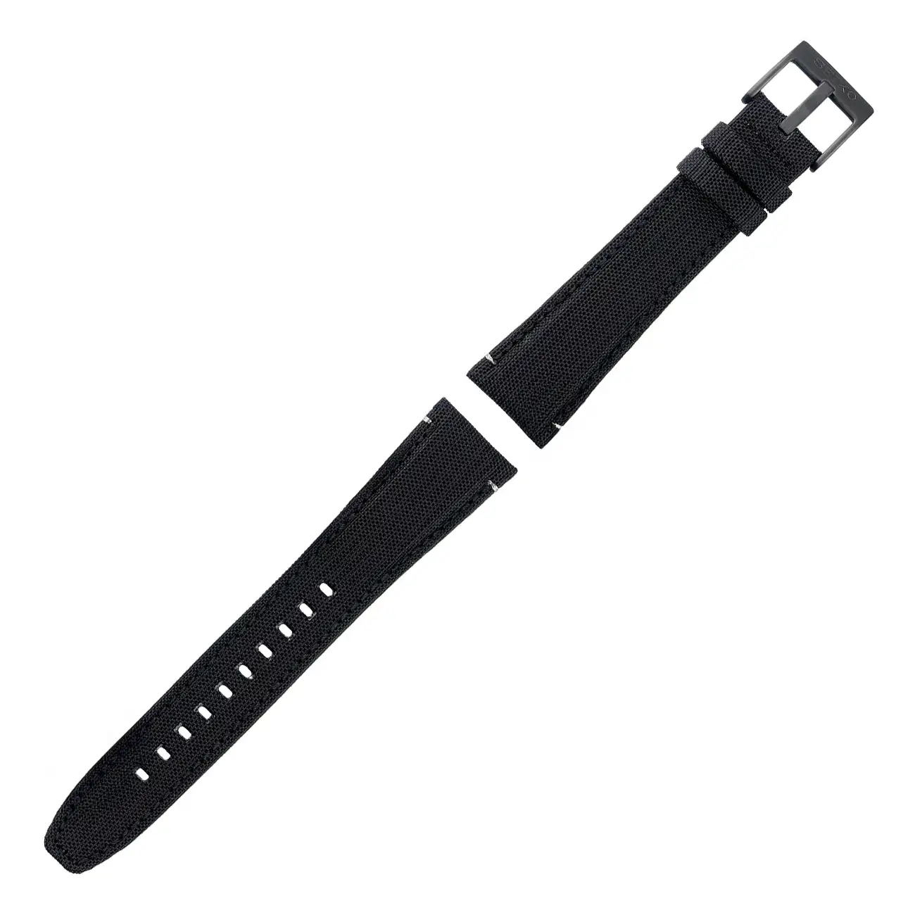 Seiko L0KF014M0 o szerokości 22 mm to hybrydowy pasek, który łączy solidność skórzanej bazy z nowoczesnym wykończeniem tekstylnym. Wierzchnia warstwa materiału o gęstym, drobnym splocie tworzy strukturę przypominającą matową kratkę, nadając całości techniczny wygląd.